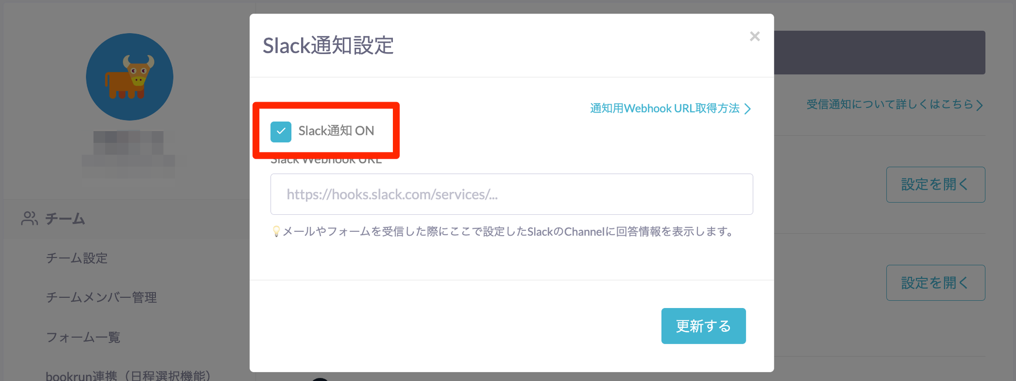 - Slack通知設定のモーダルより、「Slack通知ON」にチェックを入れる。
