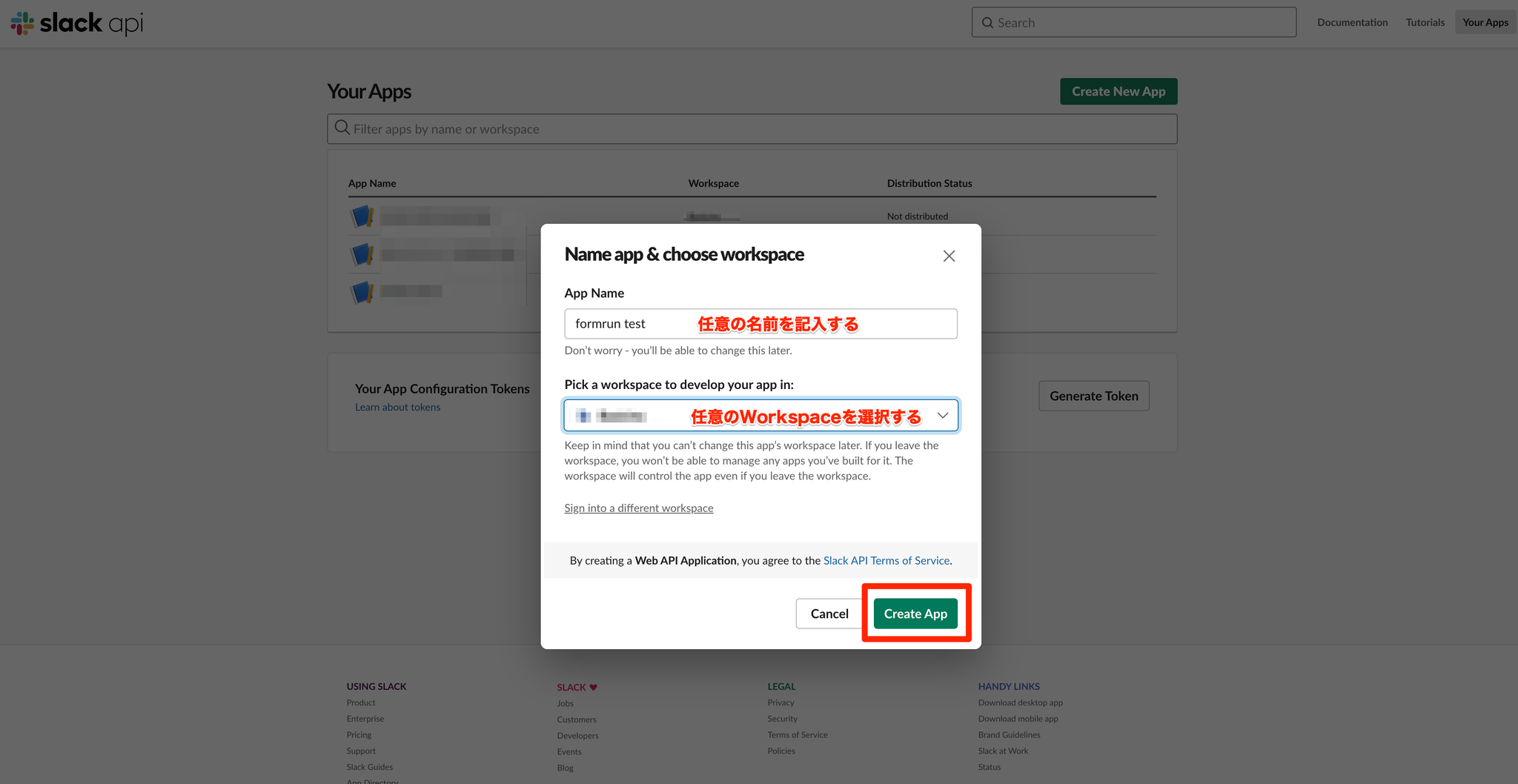 - 「App Name 」と「Development Slack Workspace」を設定し「Create App」をクリックする