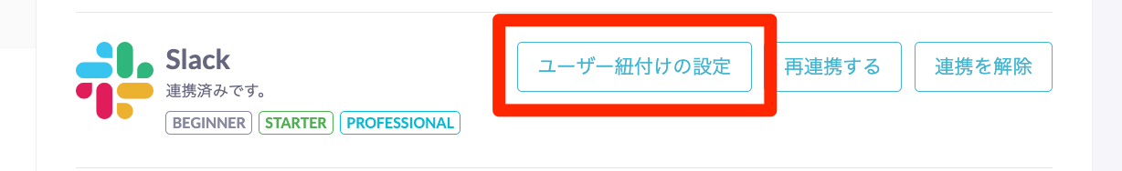 - Slackの「ユーザー紐付けの設定」をクリックする