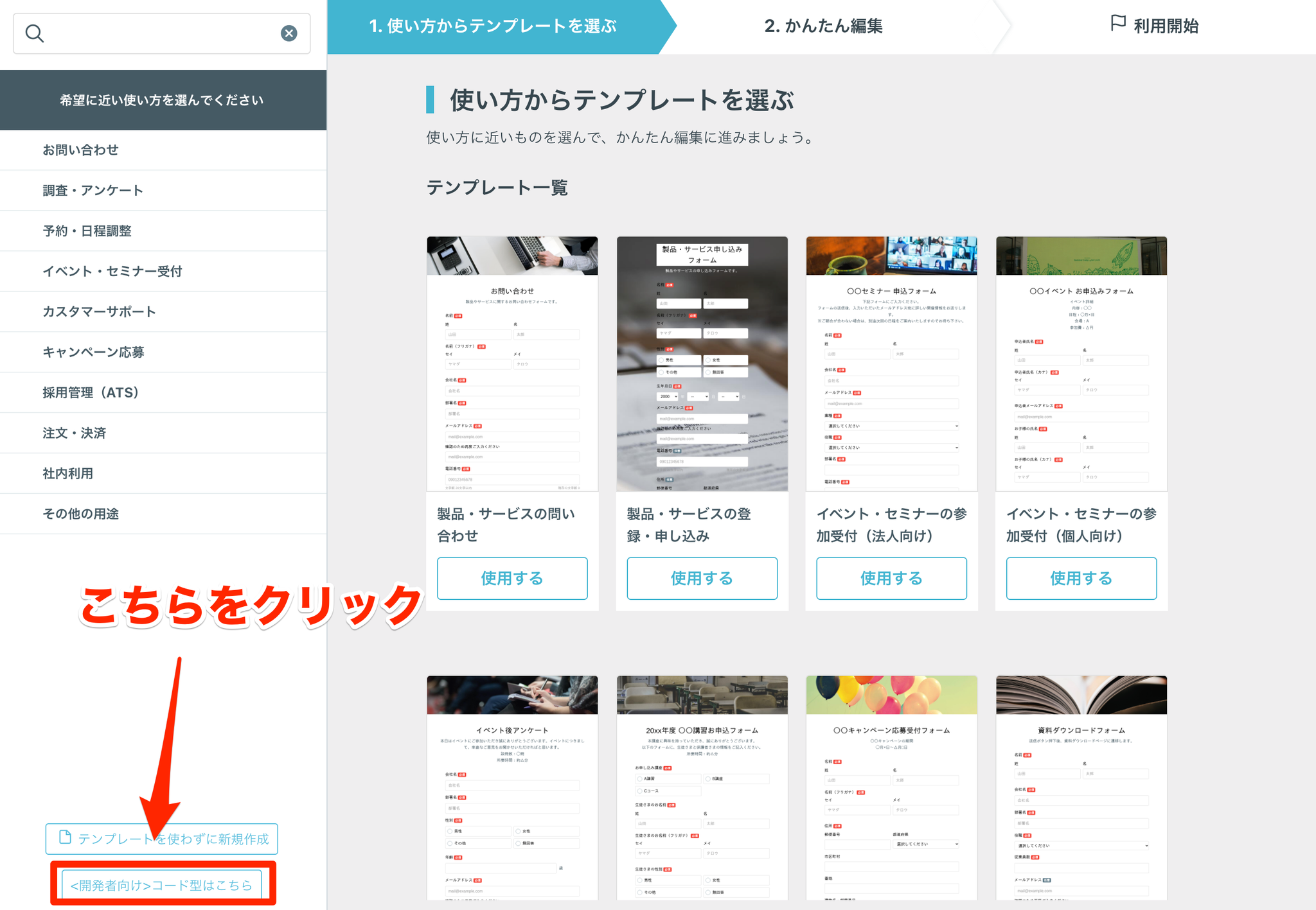 - テンプレート選択画面の左下「<開発者向け>コード型はこちら」をクリックする