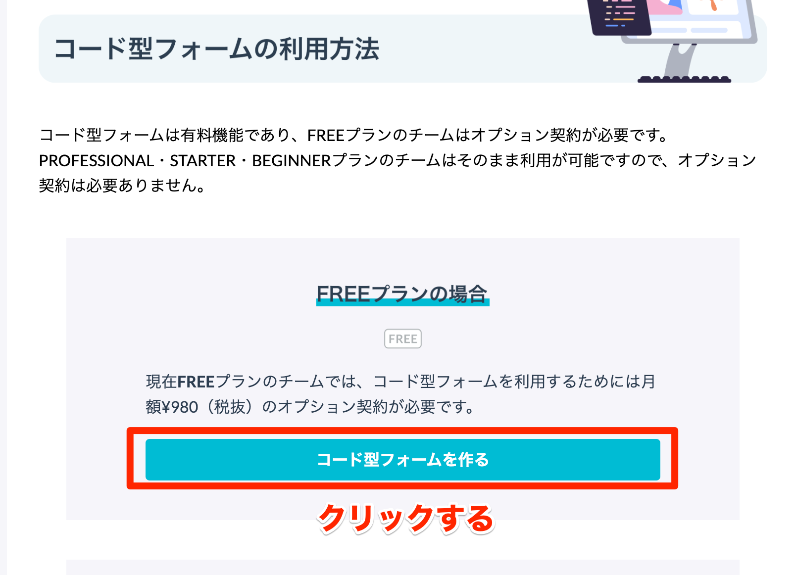 - 「コード型フォームの紹介」ページで「コード型フォームを作る」をクリックする