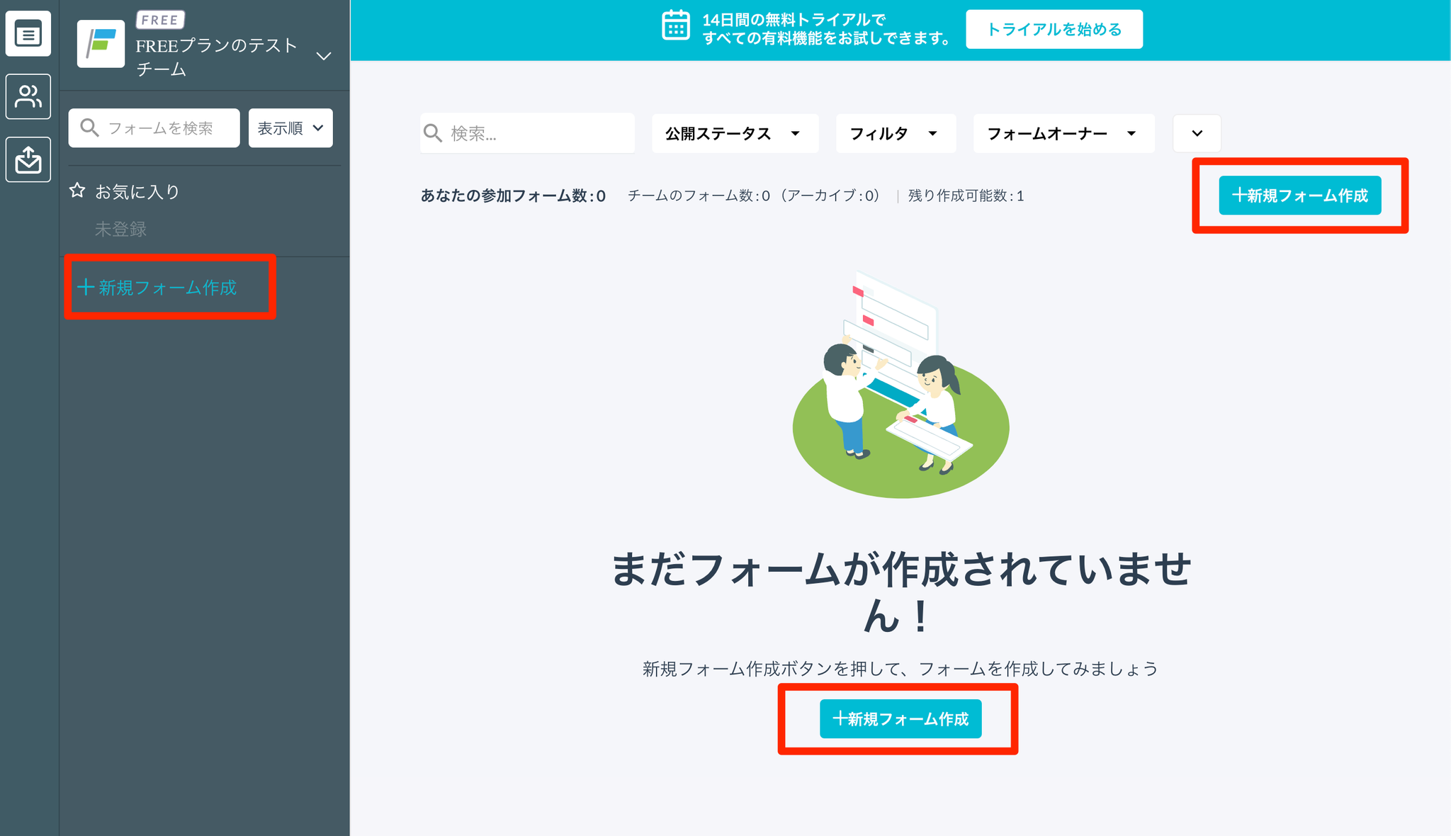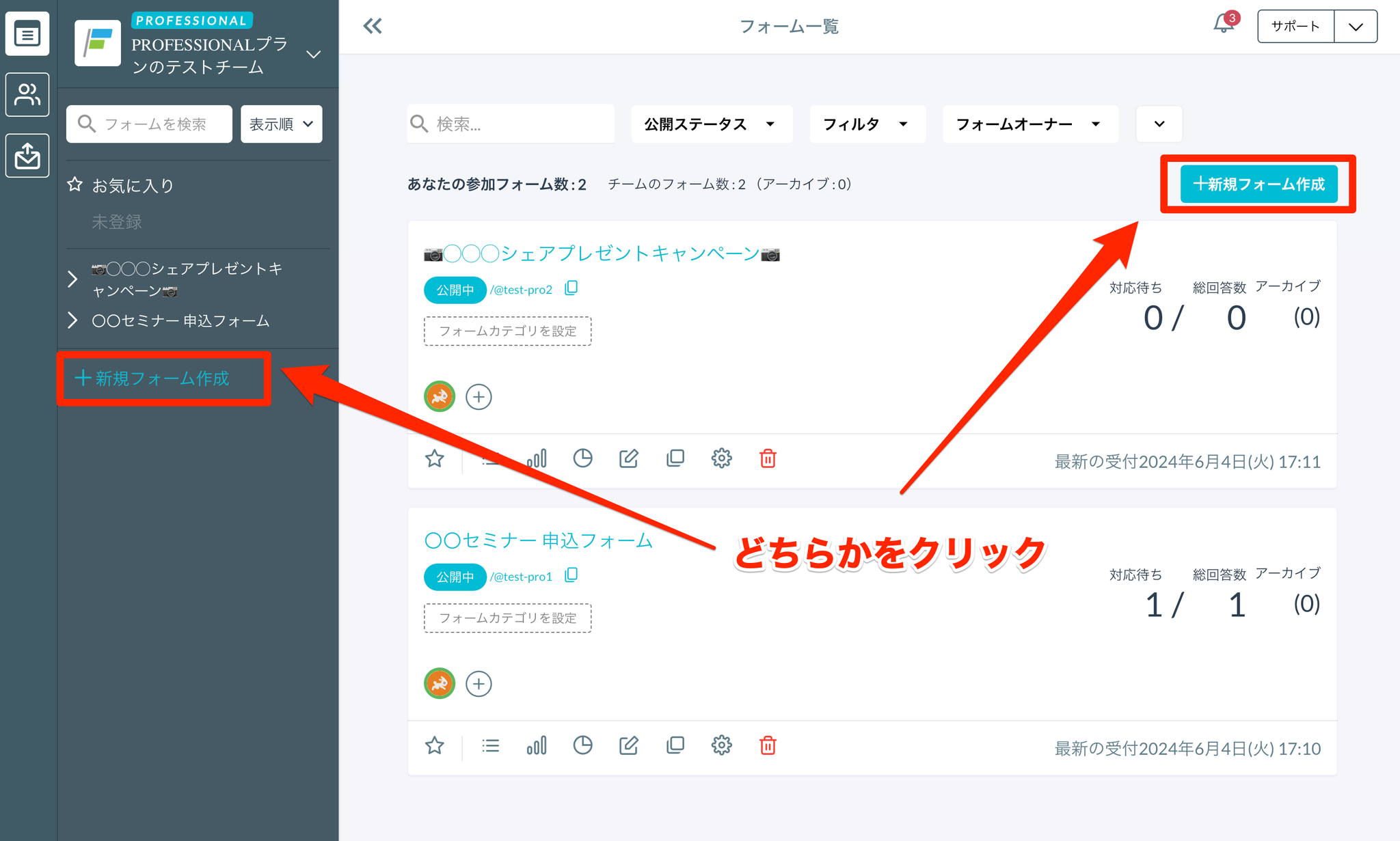 - フォーム一覧画面 または サイドバーの最下部 より「新規フォーム作成」をクリックする