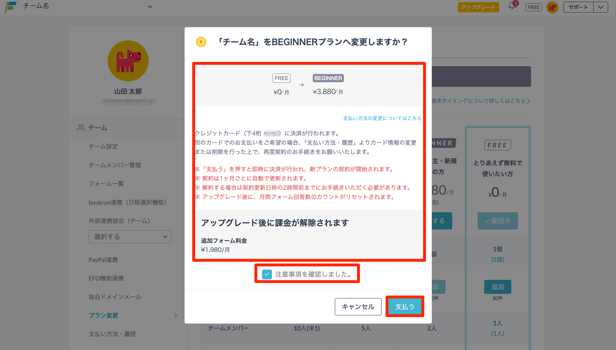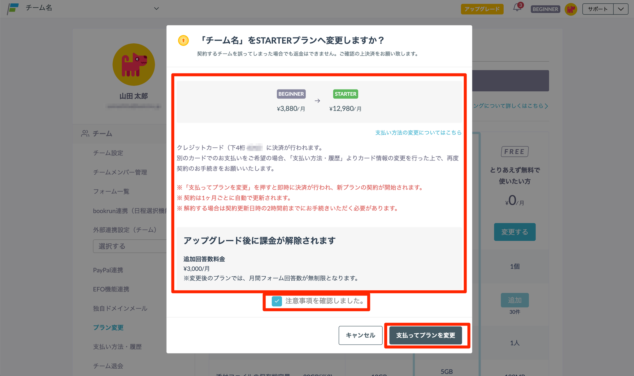 - 上位プランの利用料金が発生すること、アップグレード後に追加回答数料金の課金は解除されることを含め、表示の内容を確認します。 「注意事項を確認しました。」にチェックを入れ、「支払ってプランを変更」をクリックします。