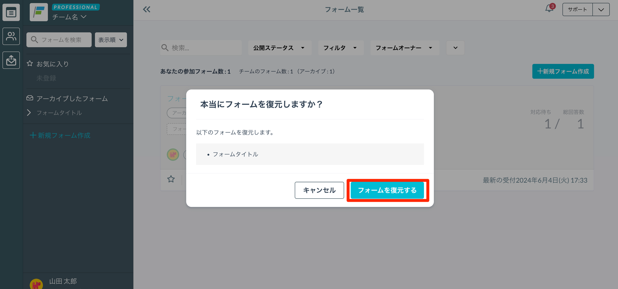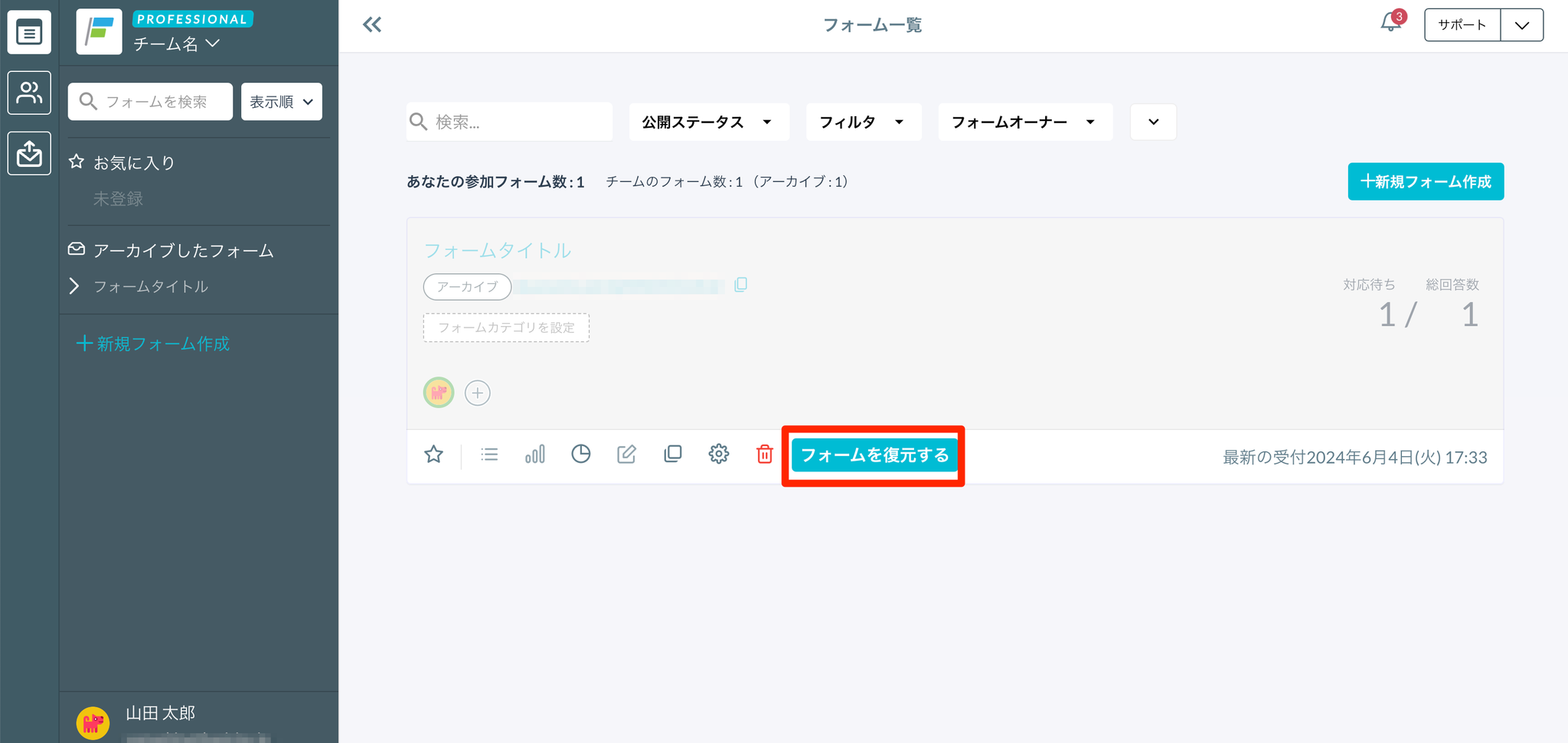 - フォーム一覧画面で、アーカイブしているフォームの「フォームを復元する」をクリックします。