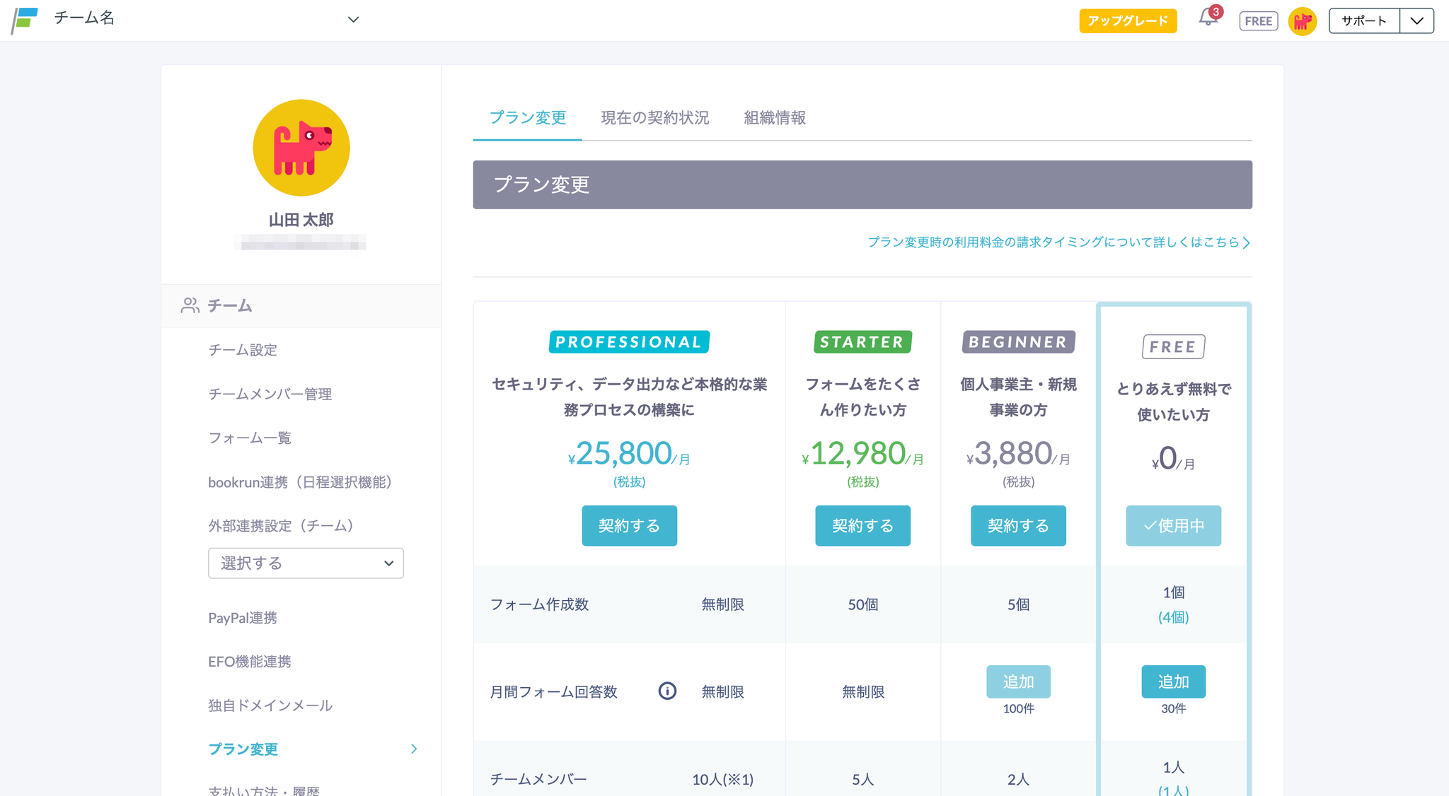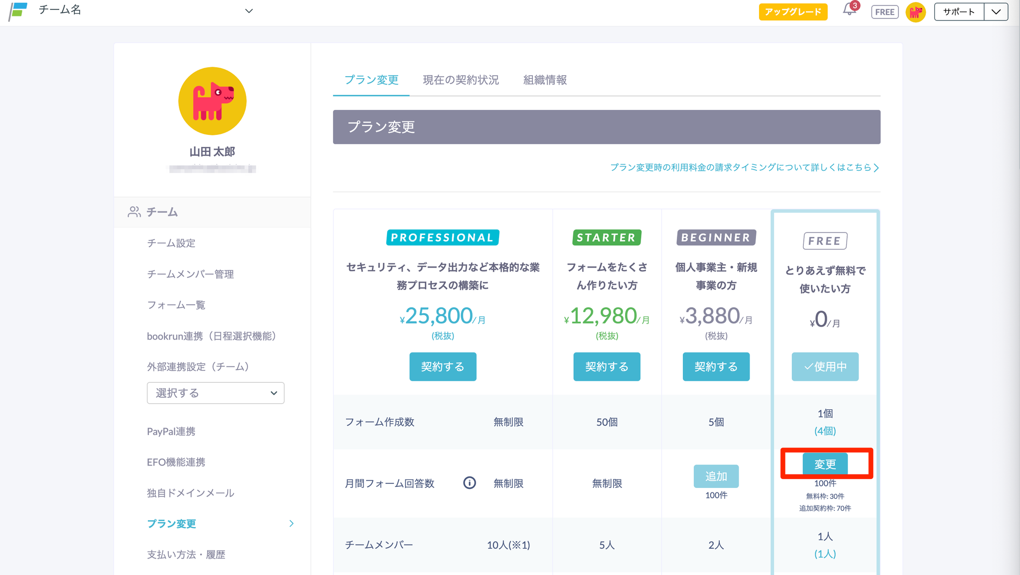 月間フォーム回答数を150件以上に設定したFREEプランのチームが、BEGINNERプランにアップグレードする場合、「上限追加オプション」は解除されるため、再度契約を行う必要があります。