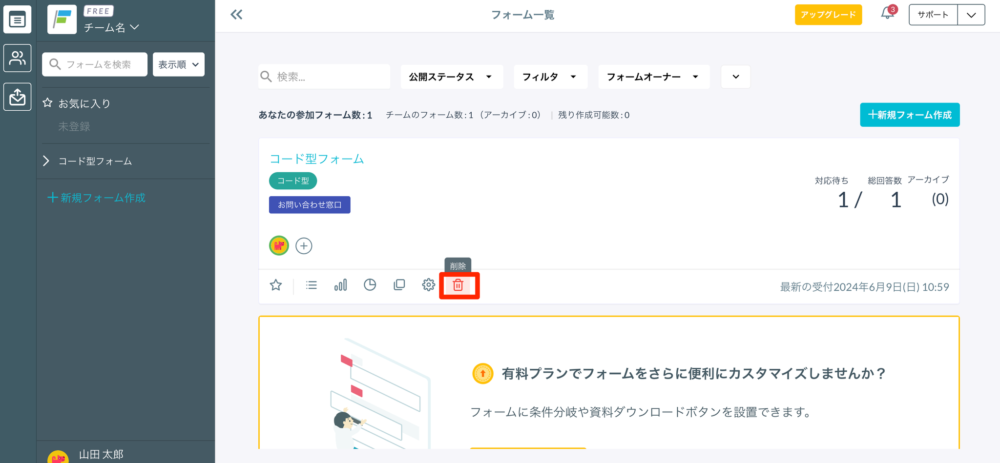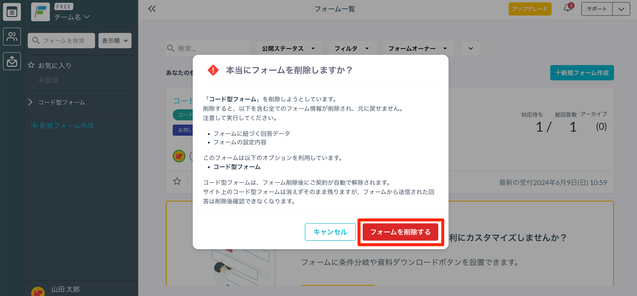 フォーム一覧画面で削除アイコンをクリックし、「フォームを削除する」をクリックします。