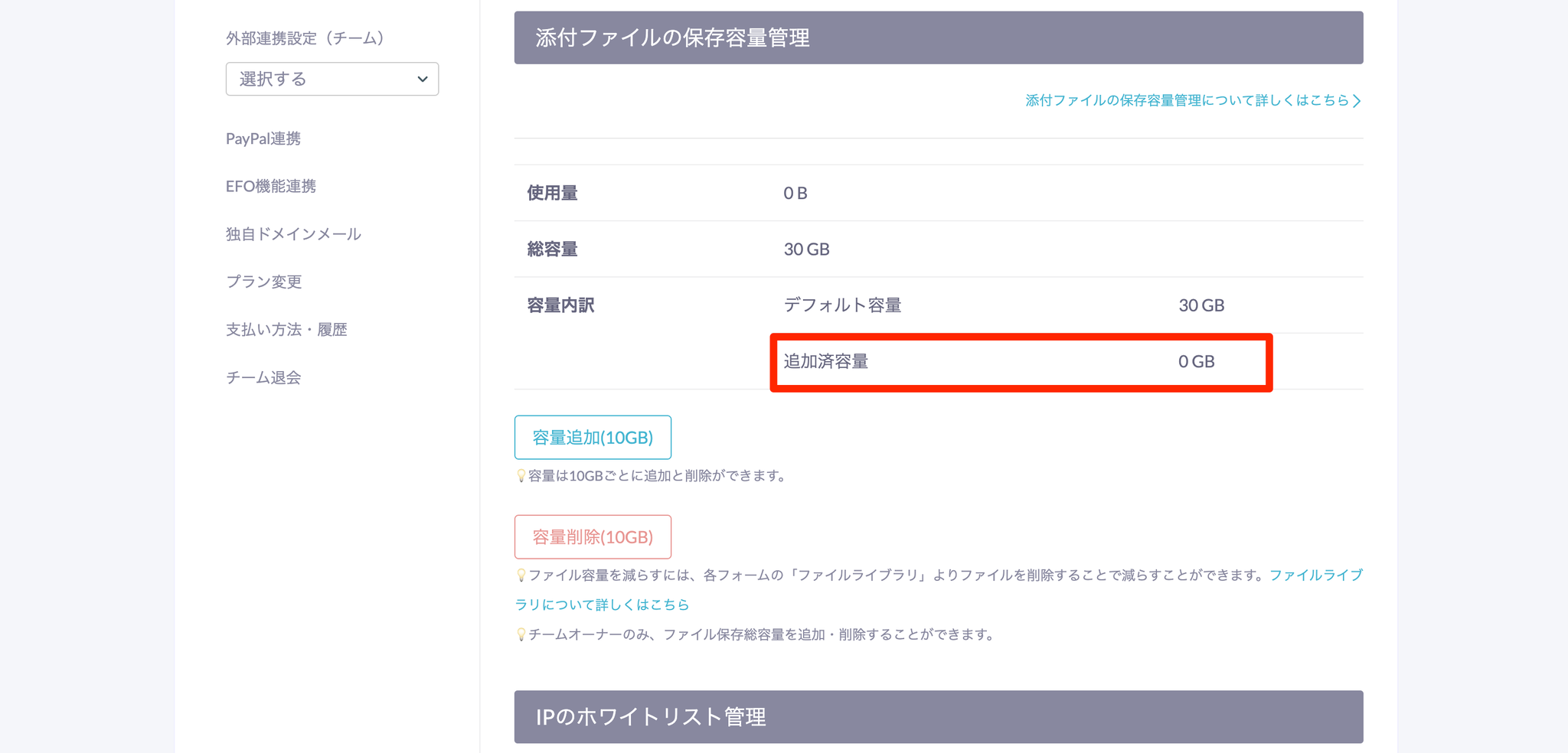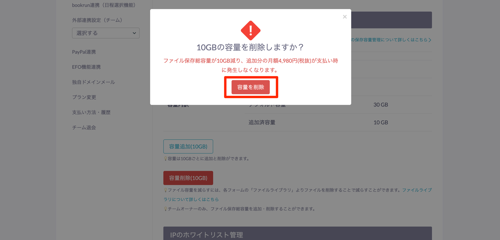 - 「添付ファイルの保存容量管理」の「容量削除(10GB)」をクリックします。