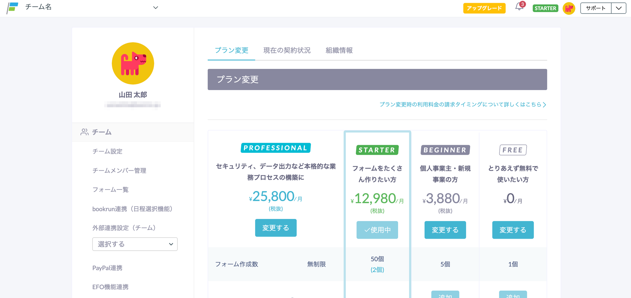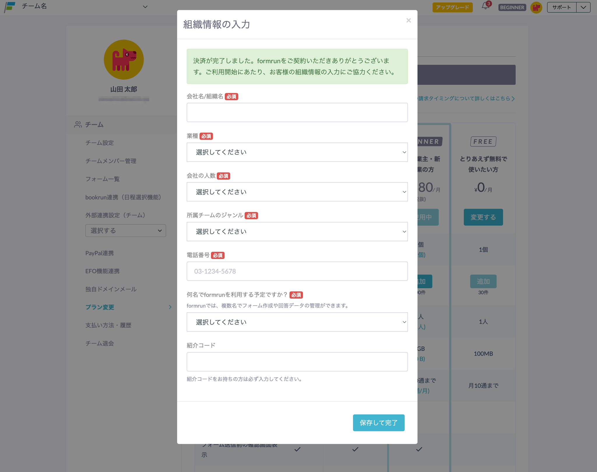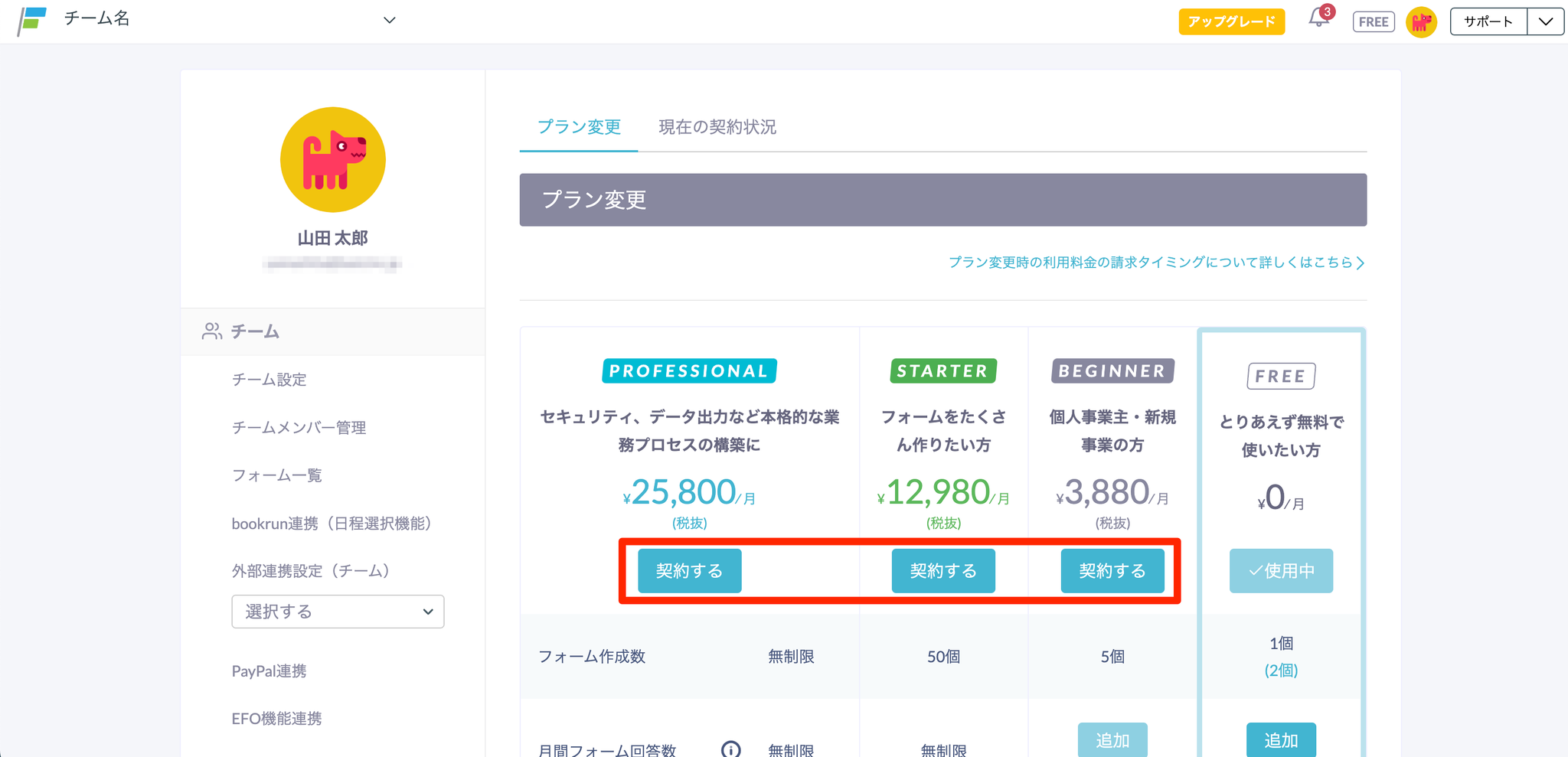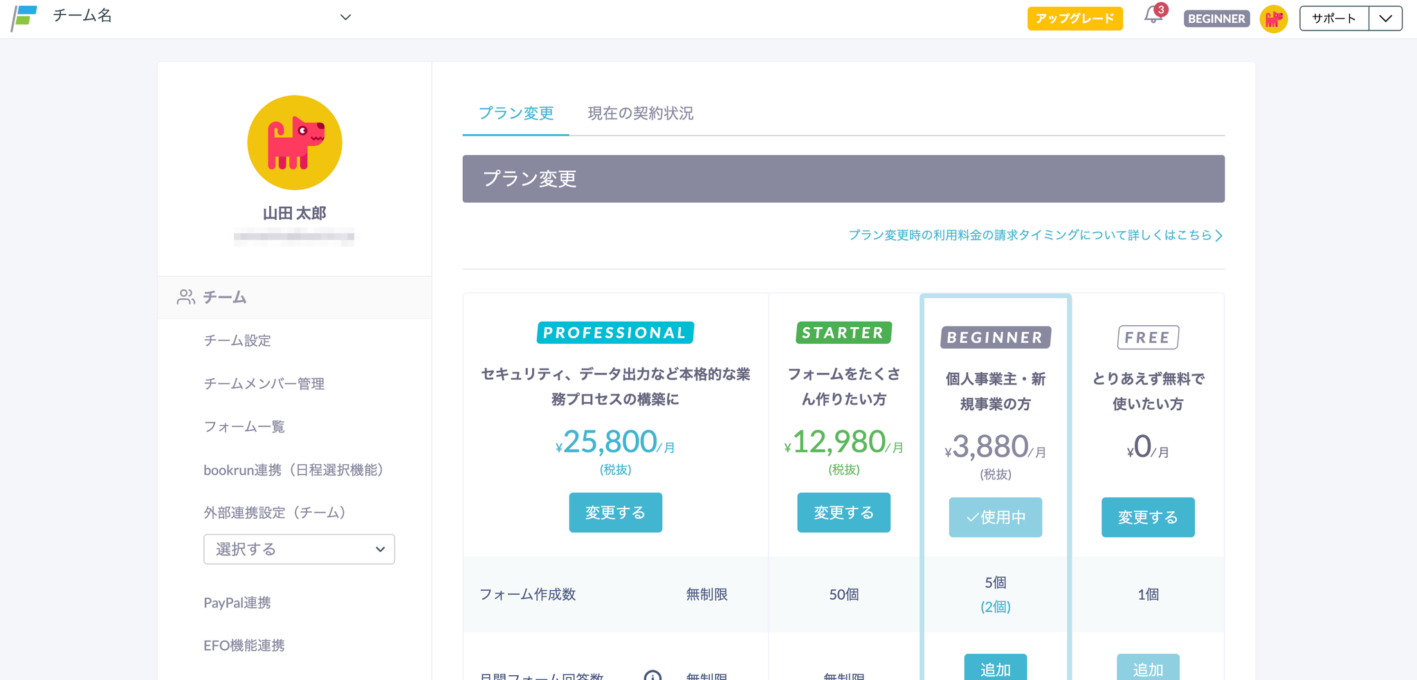 - BEGINNERプラン(フォーム数上限:5個)にアップグレードする