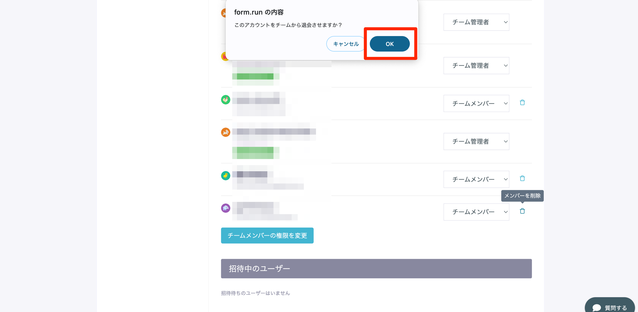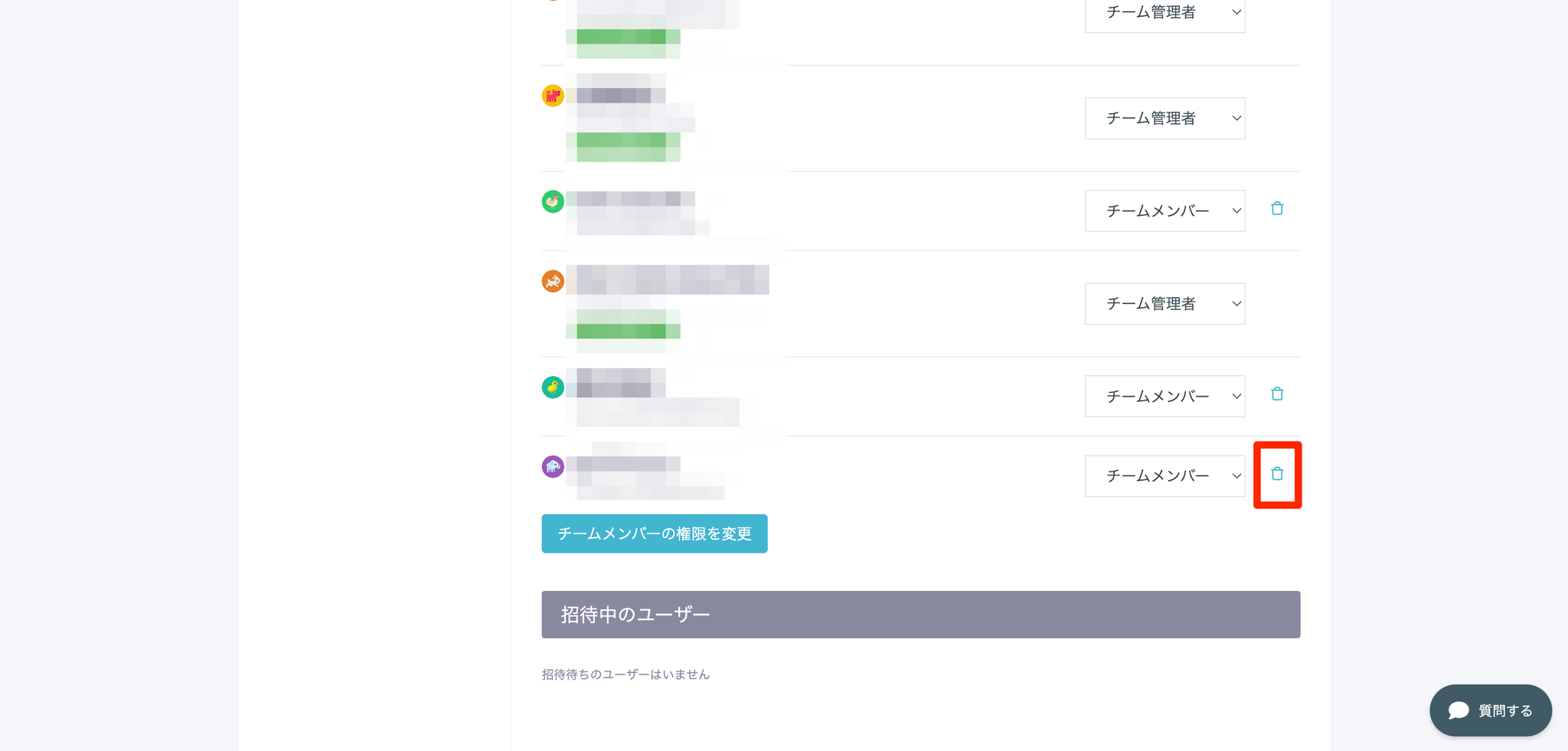 - 退会させたいメンバーの右にあるゴミ箱アイコンをクリックします。