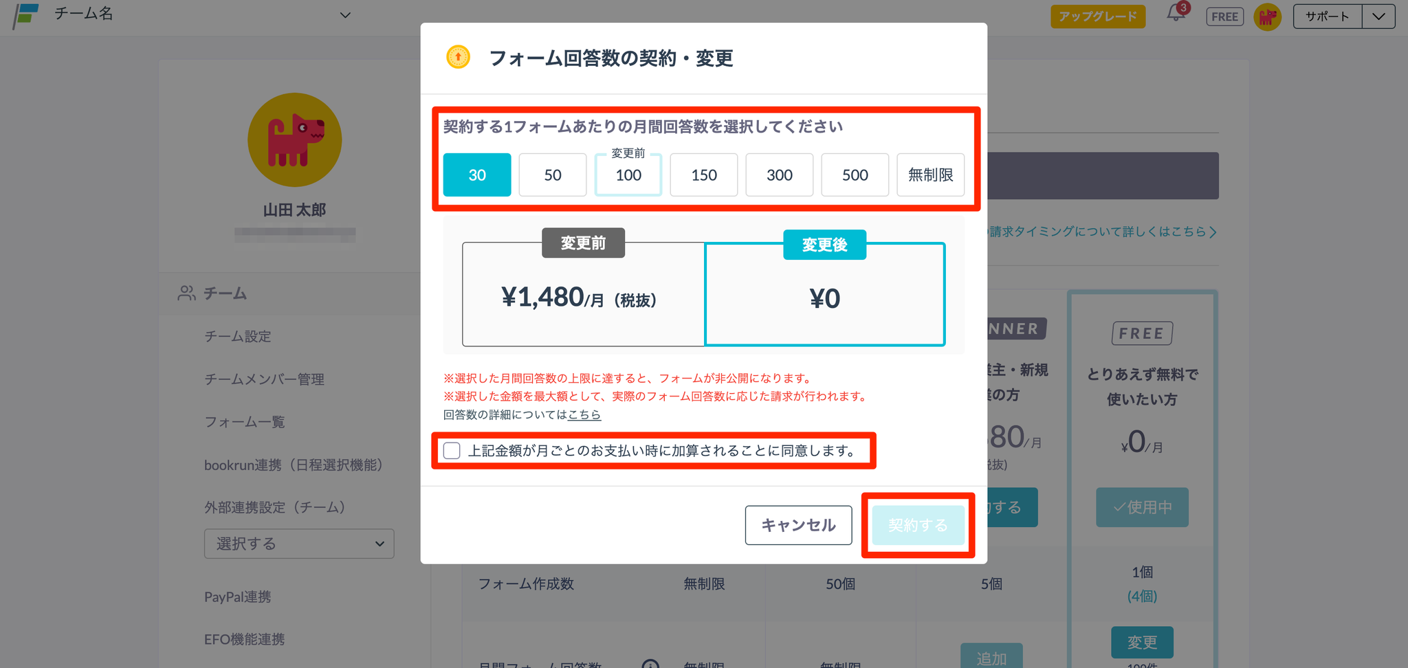 - 1フォームあたりの月間回答数で、FREEプランであれば「30」、BEGINNERプランであれば「100」を選択し、「上記金額が月ごとのお支払い時に加算されることに同意します。」にチェックを入れ、「契約する」ボタンをクリックします。