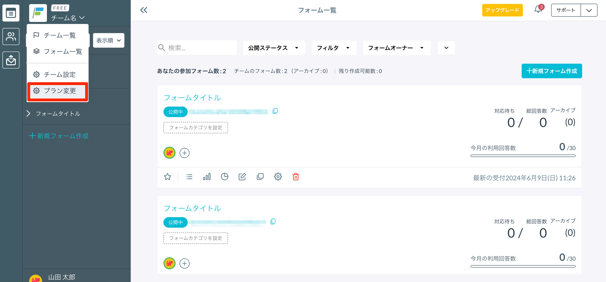 - FREEプラン(フォーム数上限:1個)で5個フォームを追加する(合計6個のフォームを保持)