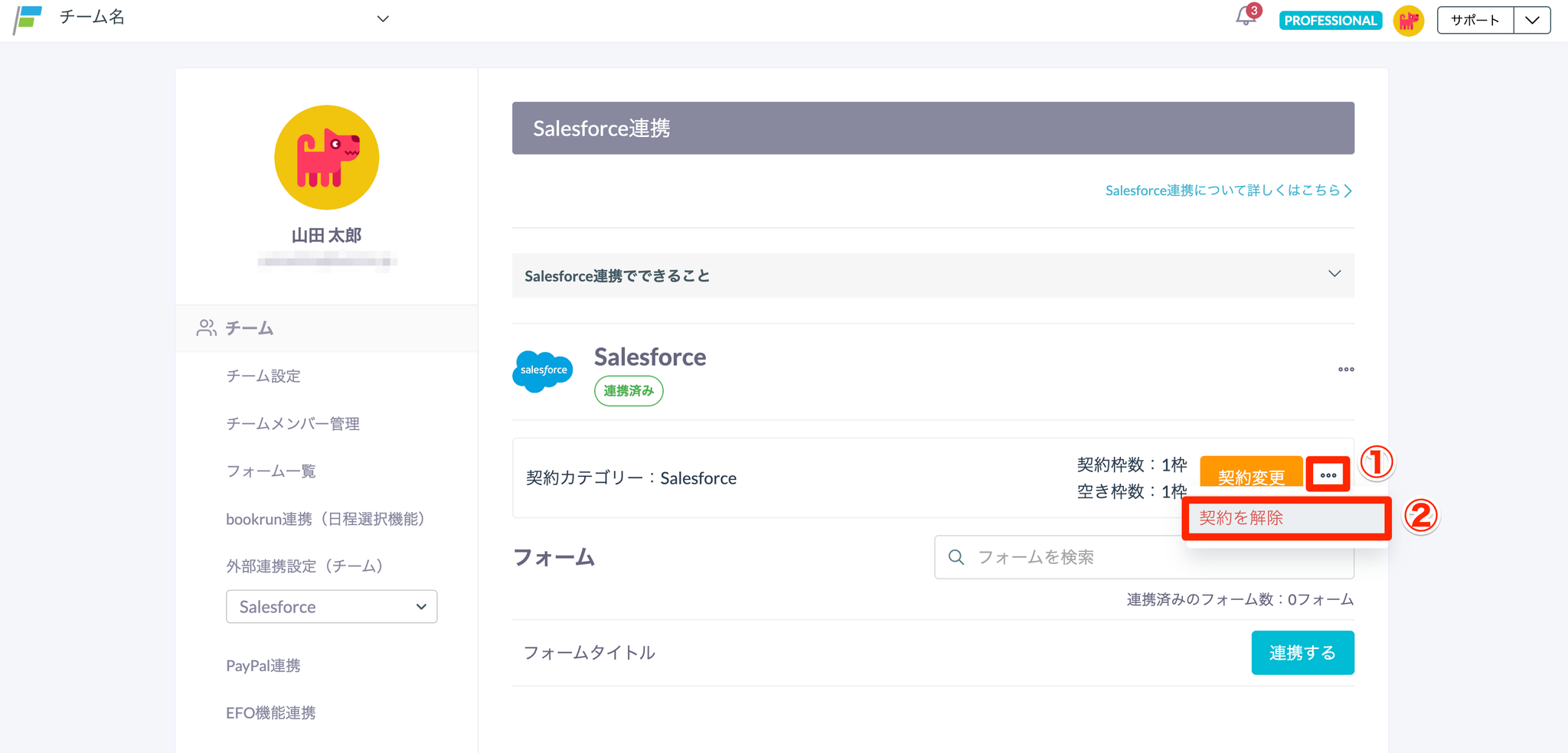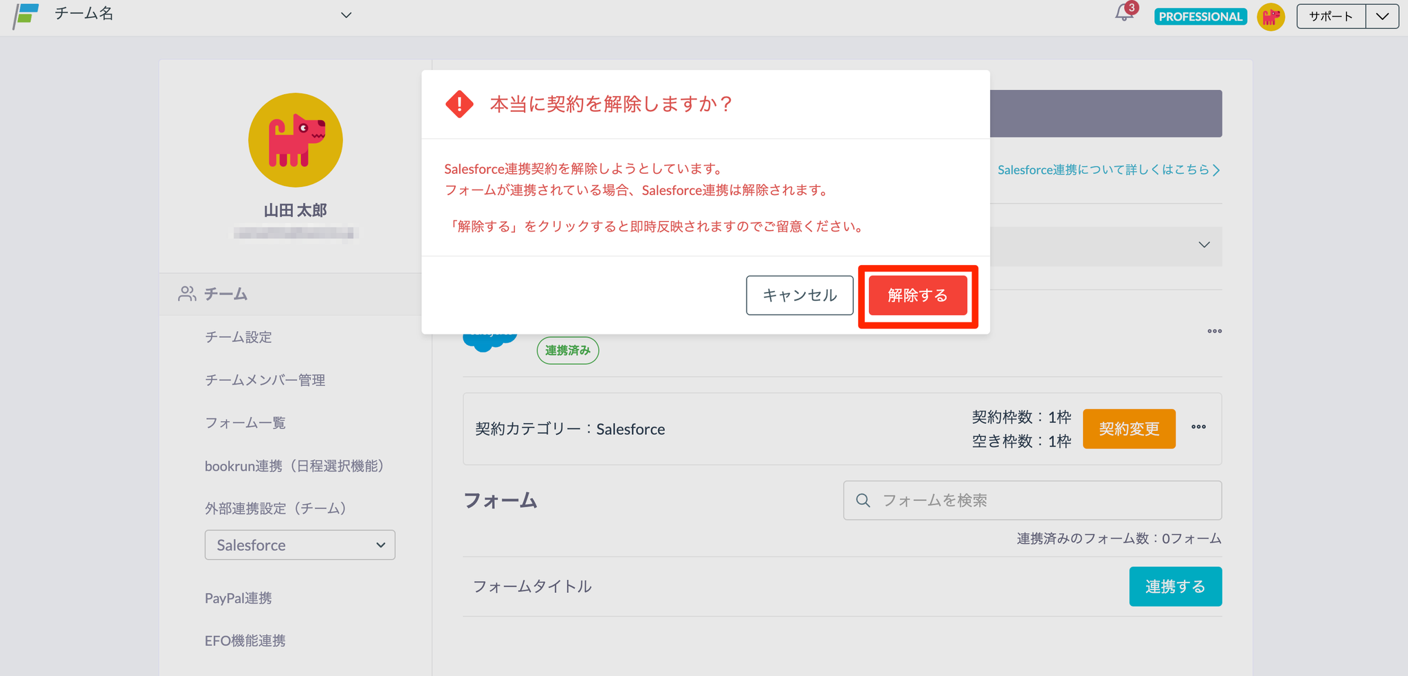 - 左メニューの「外部連携設定(チーム)」のプルダウンで、解約したい外部ツールを選択します。