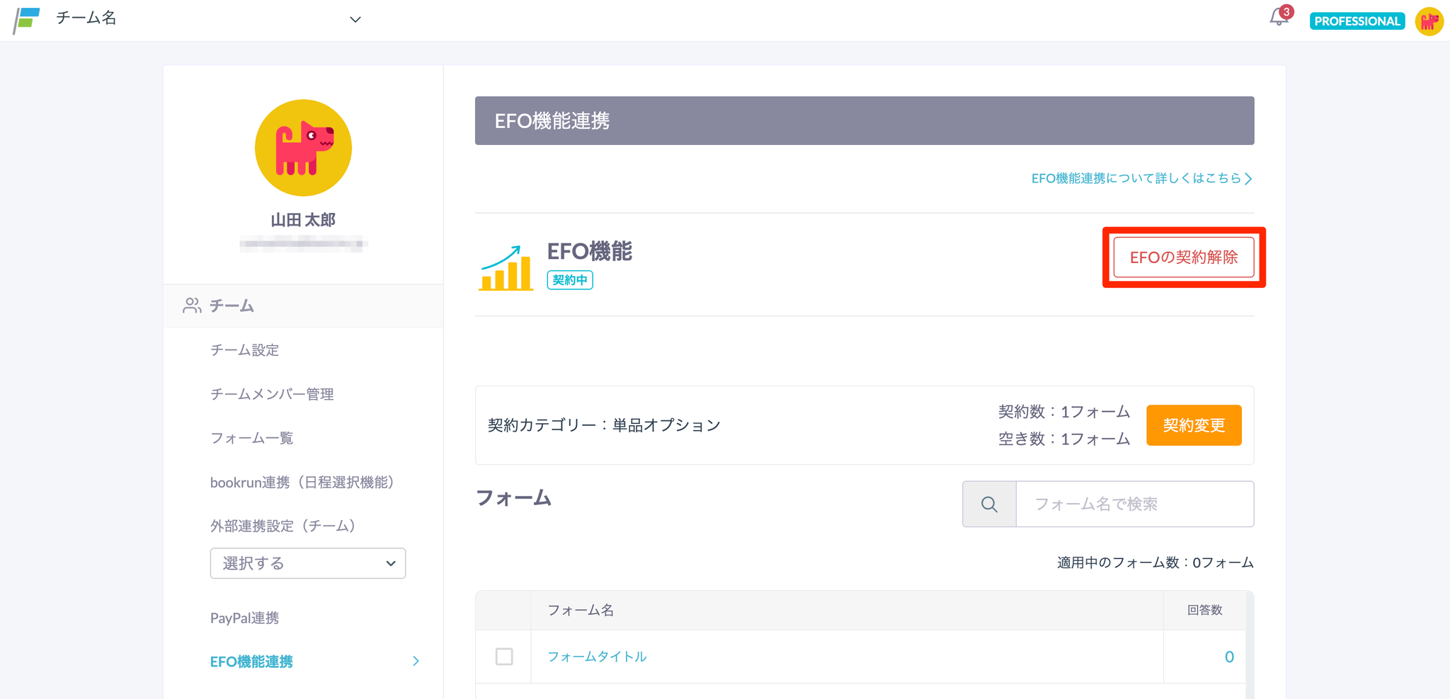 解約時の決済サイクル前払い後払いオプションごとの解約方法EFO(フォーム最適化)機能外部ツール連携機能一斉メール配信機能フォームのアーカイブ機能コード型フォーム(FREEプランのみ)フォーム購入オプションA. フォームを削除するB. フォームをアーカイブするC. 上位プランへアップグレードする月間フォーム回答数の上限追加オプションA.上位プランにアップグレードするB.オプションの契約内容を変更するメンバー追加(PROFESSIONALのみ)フォーム保存容量追加(PROFESSIONALのみ)