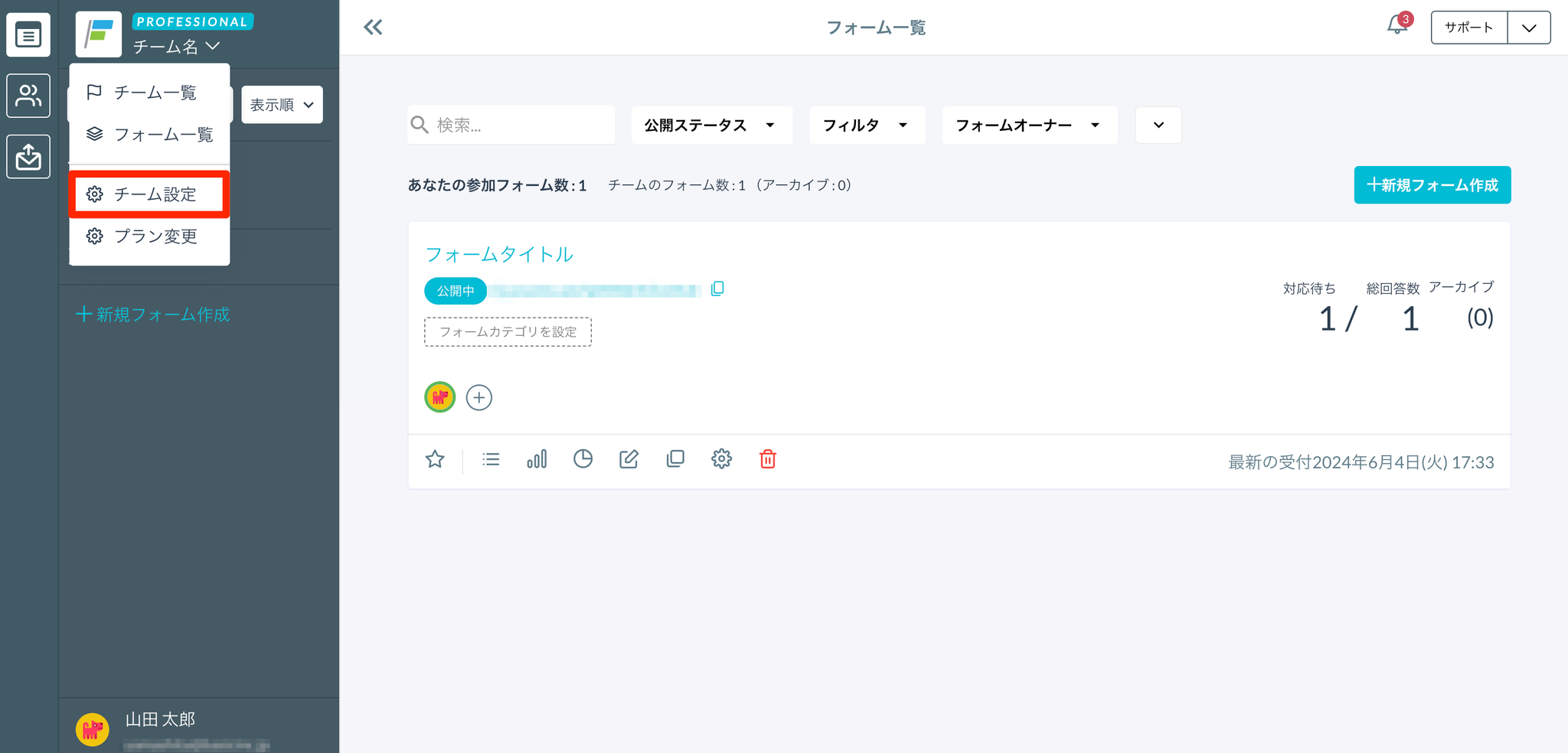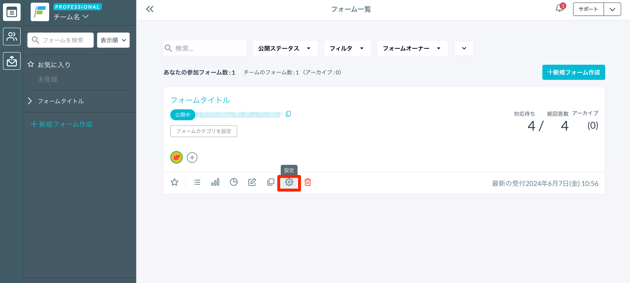 - フォーム一覧画面から、フォーム設定画面を開きます。