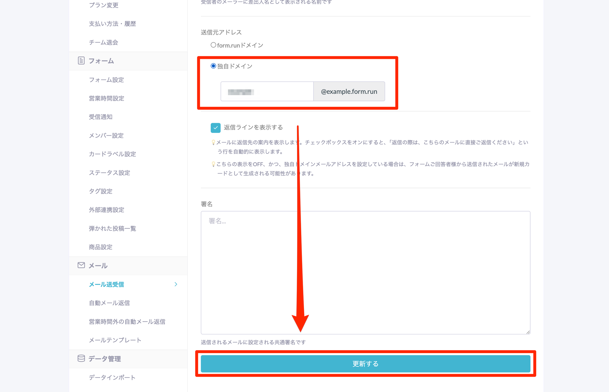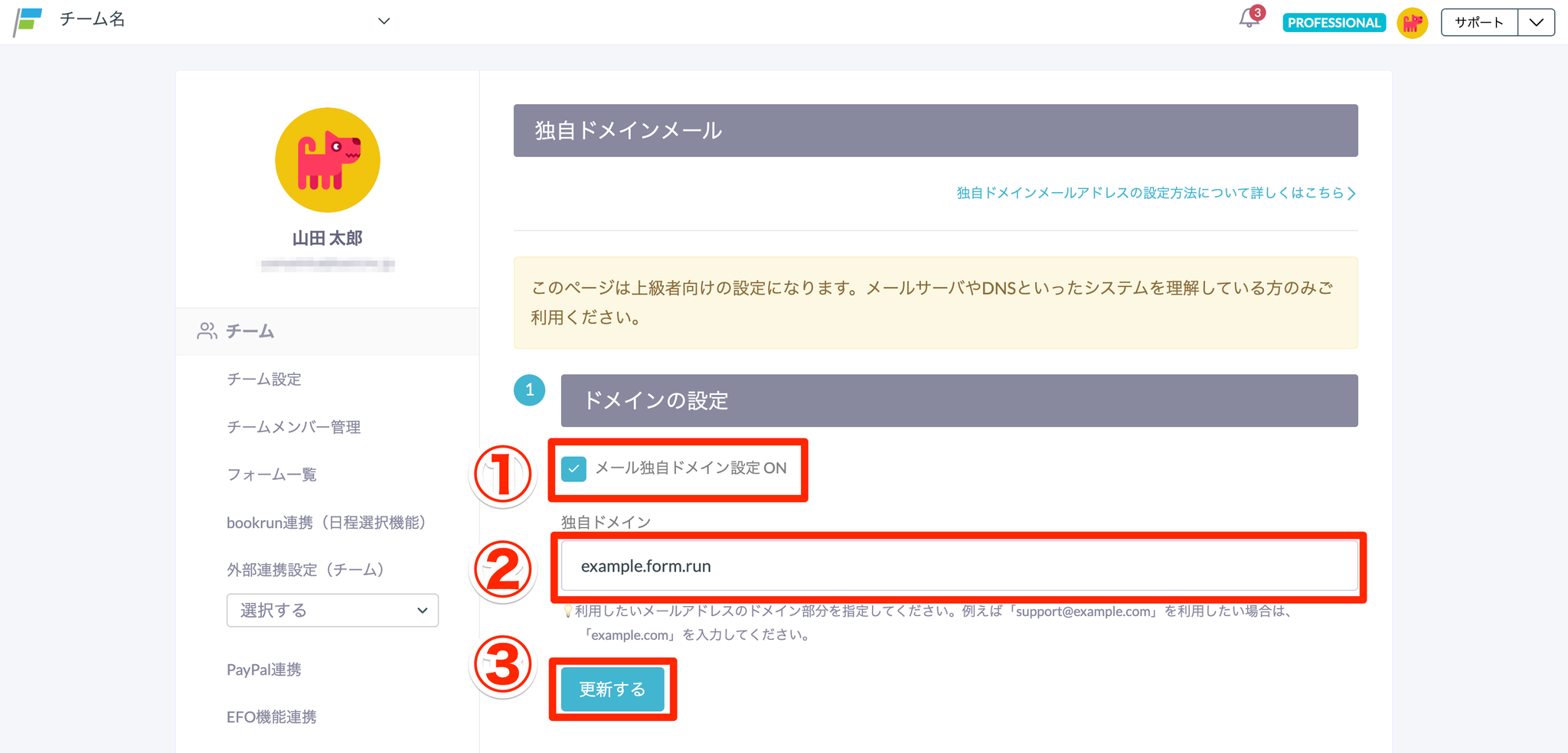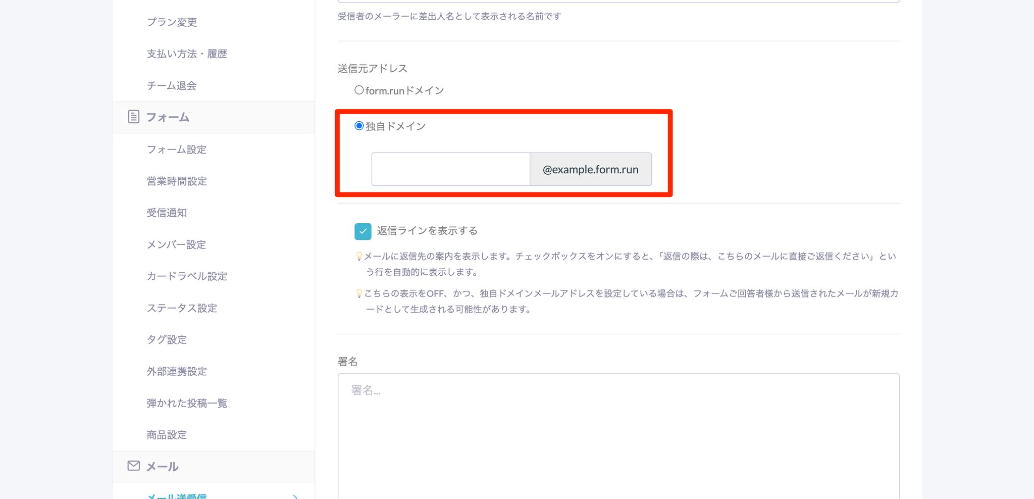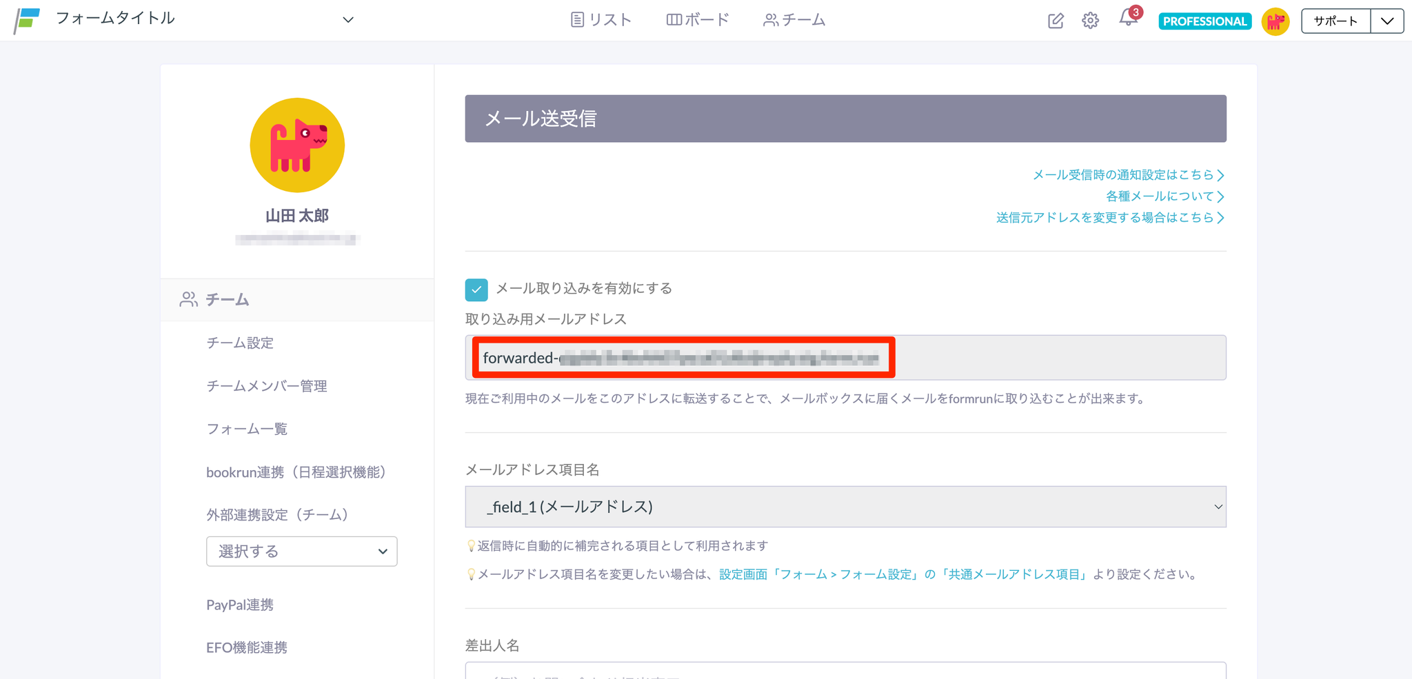 PROFESSIONALプランの場合のみ、formrunから送信されるメールの送信元を独自ドメインメールアドレスに変更できます。