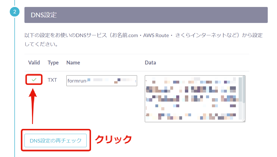 - DNS設定を行った後、「DNS設定の再チェック」をクリックし、Validがチェックマークに変わることを確認します。