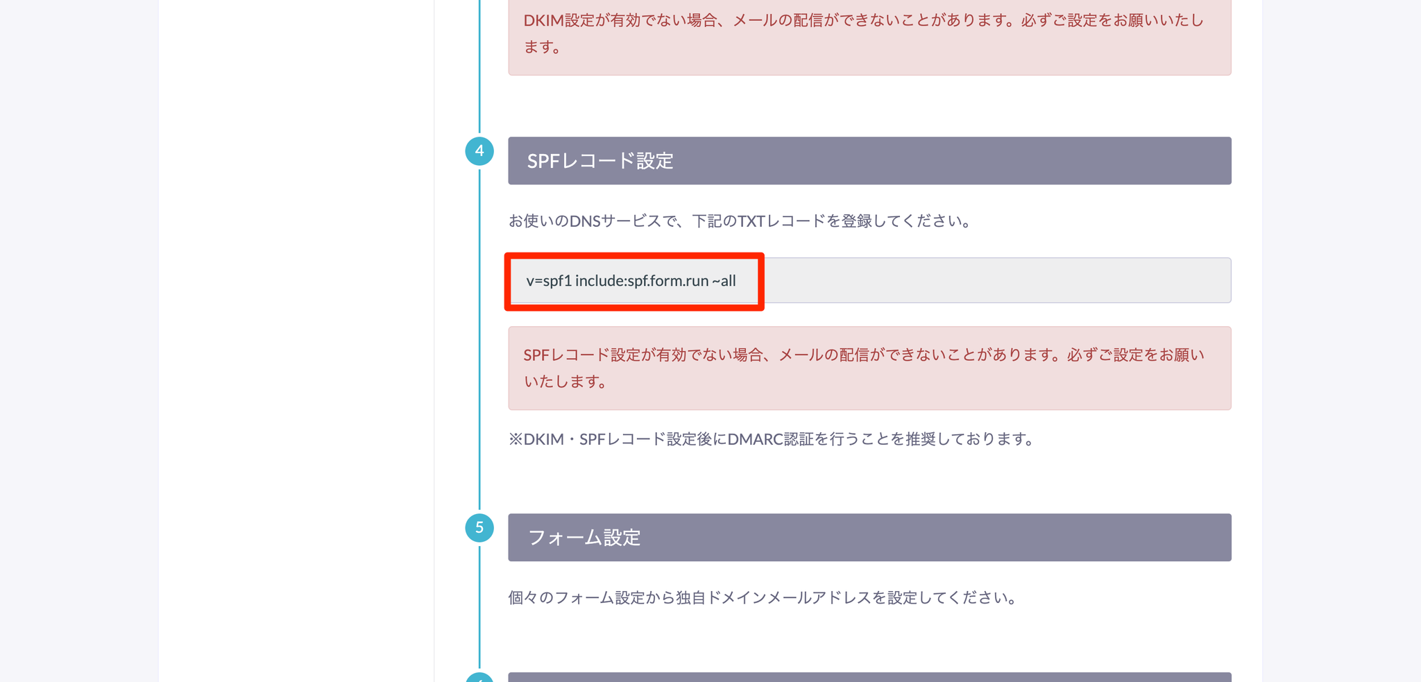 ご利用のDNSサービスの画面で、TXTレコード「「v=spf1 include:spf.form.run ~all 」を登録します。