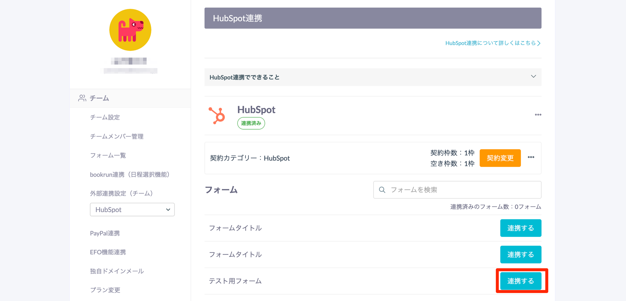 - HubSpot連携画面で、連携したいフォームの「連携する」をクリックします。
