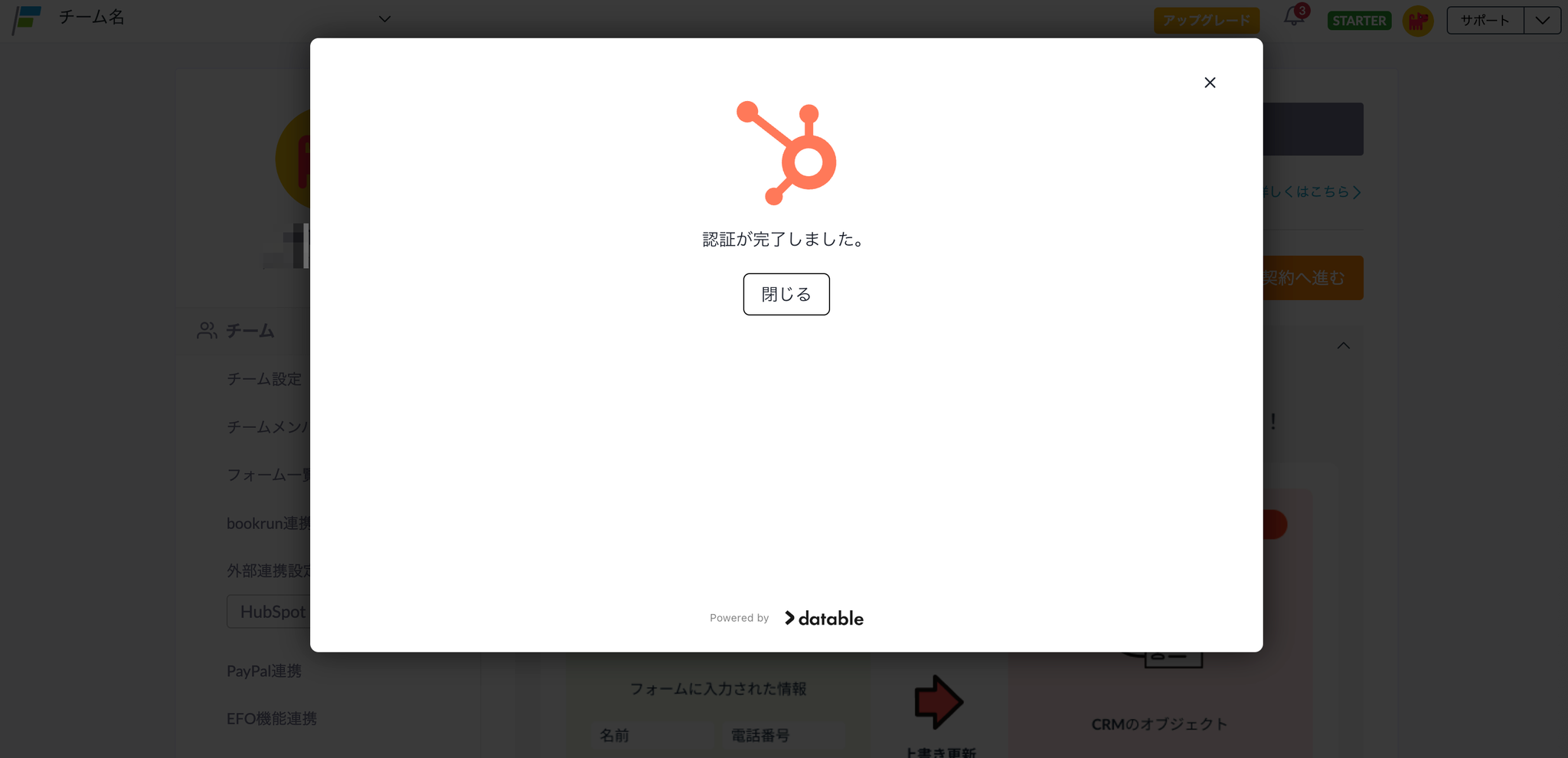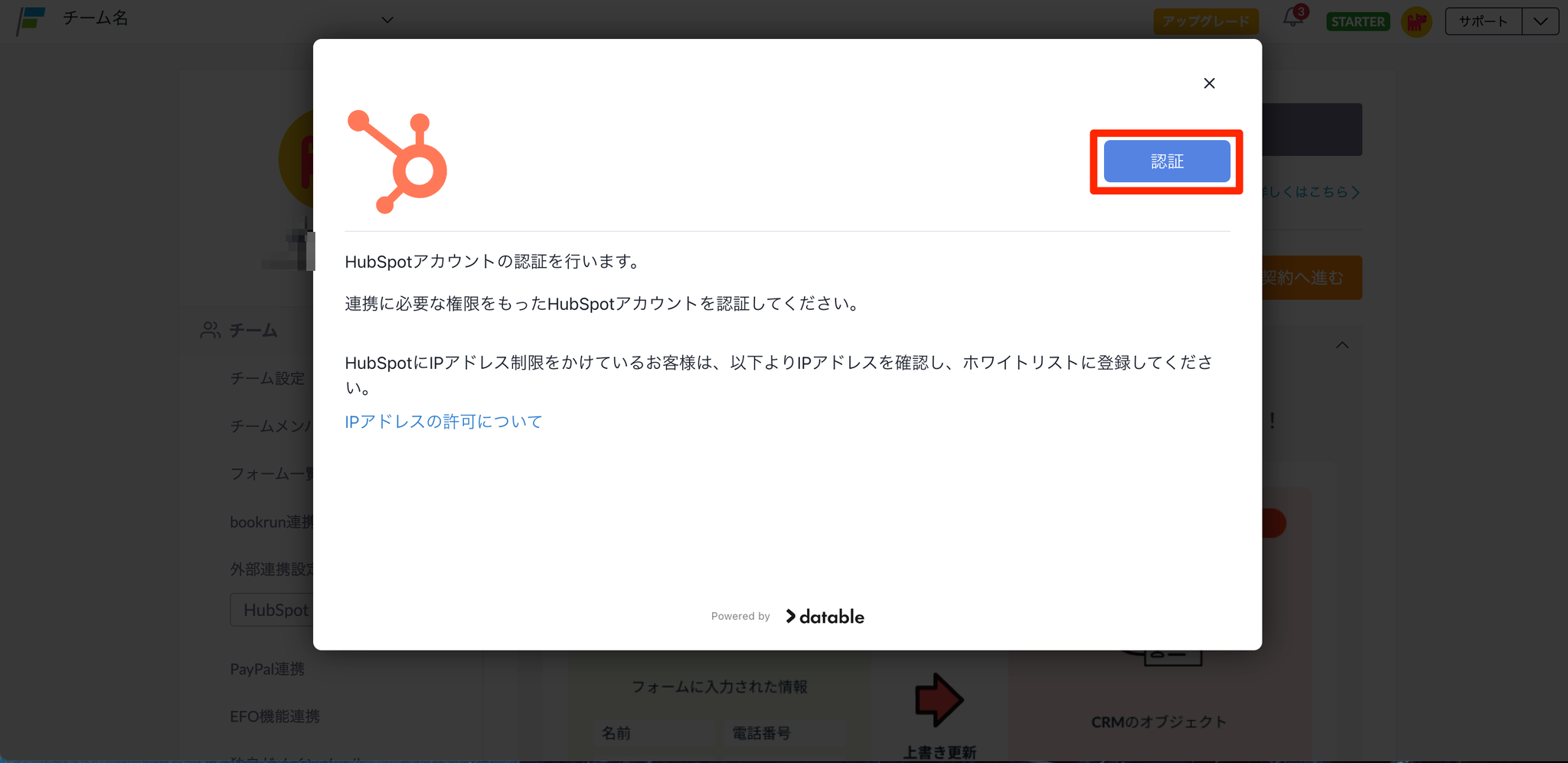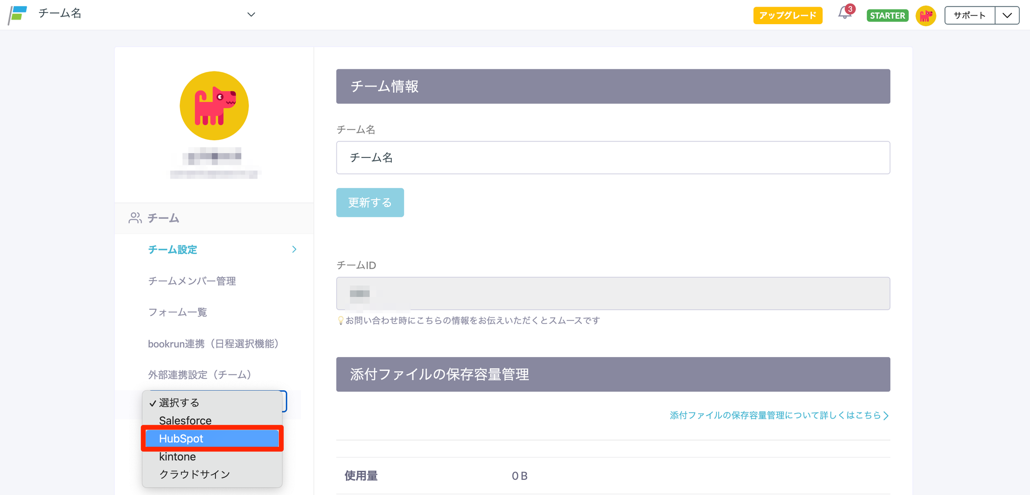 - 左メニューの「外部連携設定(チーム)」から「HubSpot」をクリックします。