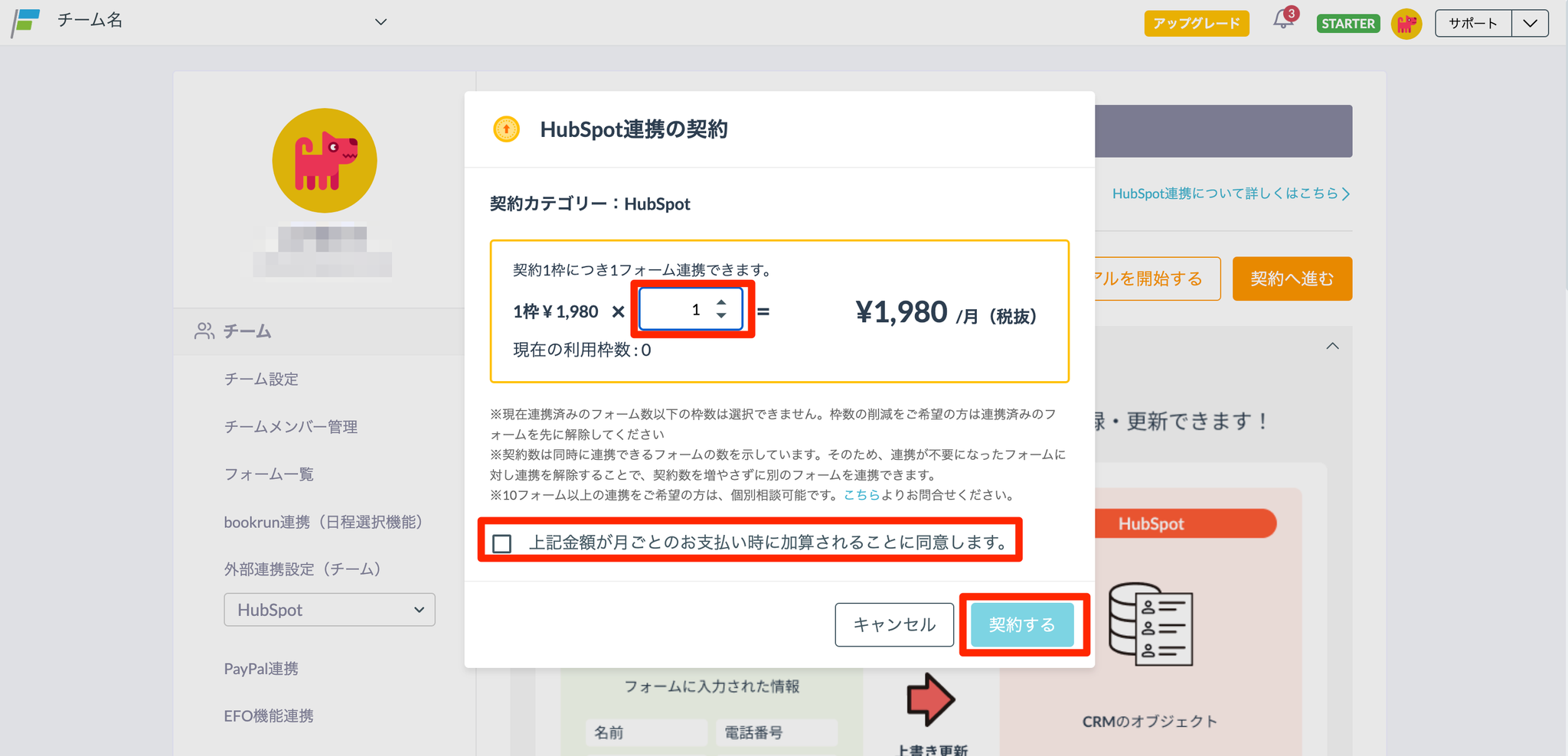 - 契約する枠数を選択し、表示されている金額が月ごとの支払いに加算されることに同意のうえ、「契約する」をクリックします。