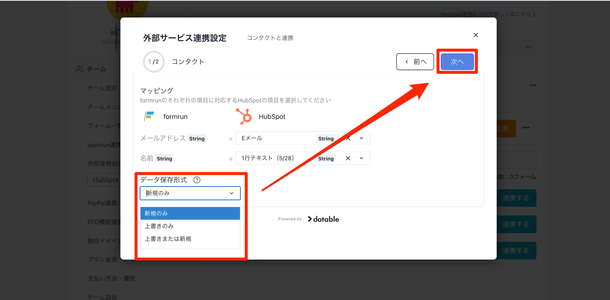 - データの保存形式を選択し、「次へ」をクリックします。 ・新規のみ:新規レコードの作成のみ行います。 ・上書きのみ:既存レコードの上書き更新のみ行います。 ・上書きまたは新規:一致キーに設定した内容があるレコードには上書きを行い、既存レコードがない場合は新規作成を行います。