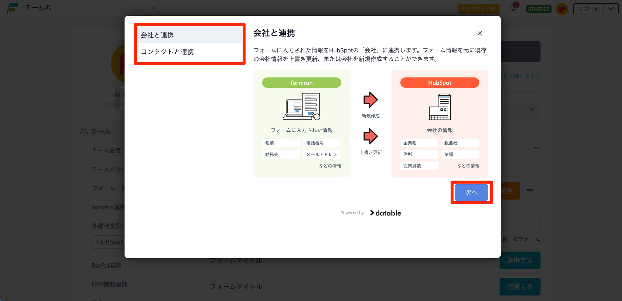 - 「会社と連携」と「コンタクトと連携」のどちらかを選択し、「次へ」をクリックします。