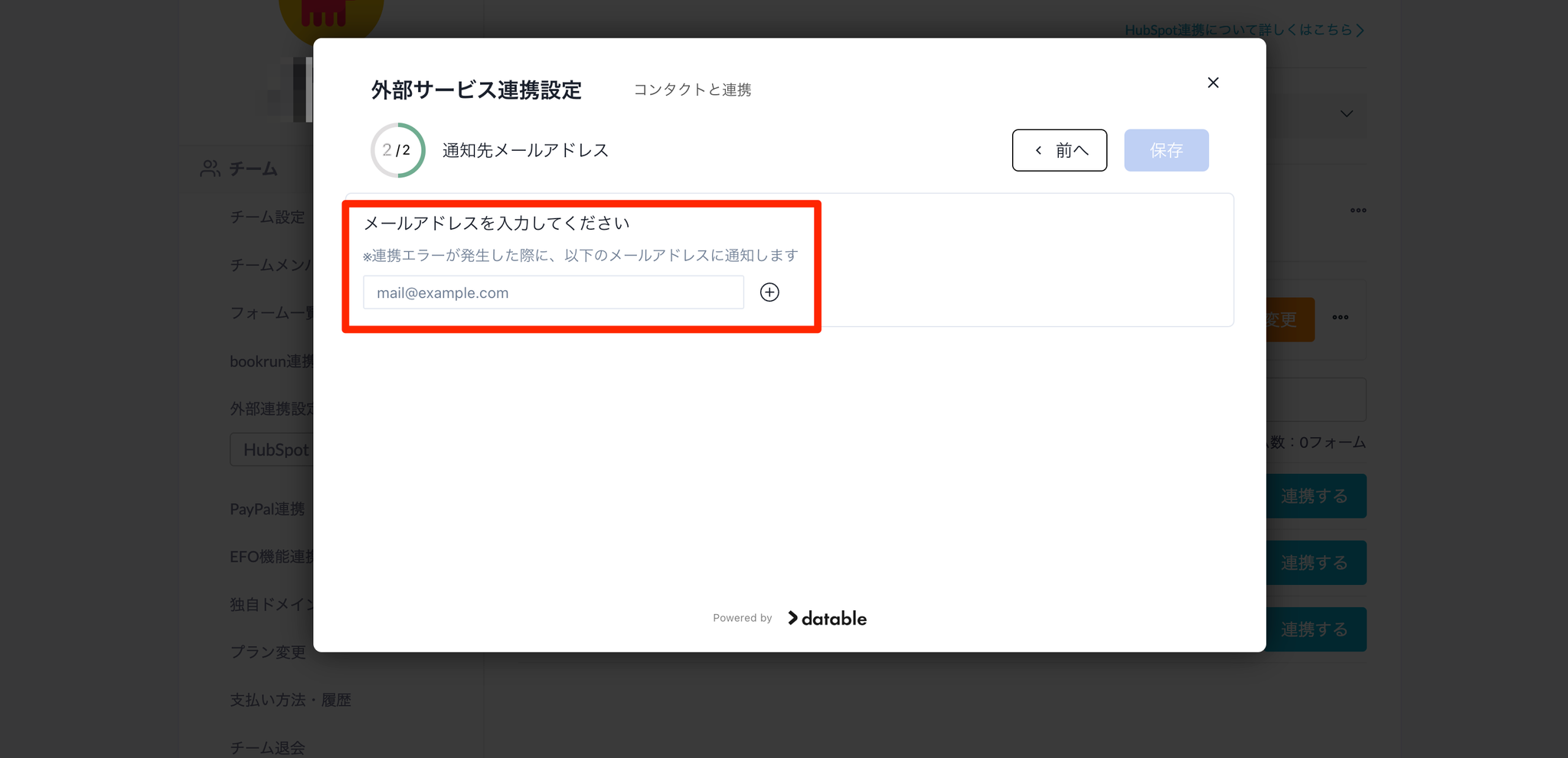 - 連携エラーが発生したときの通知先メールアドレスを入力し、「保存」をクリックします。