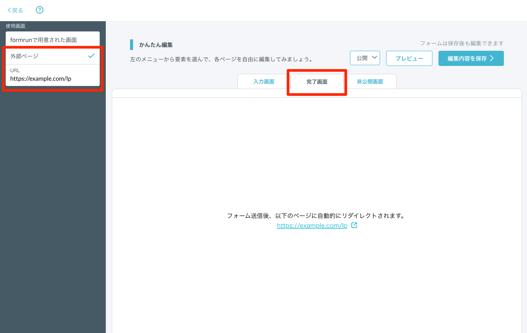 - フォーム送信後の完了画面に、自社で用意した画面を設定する
