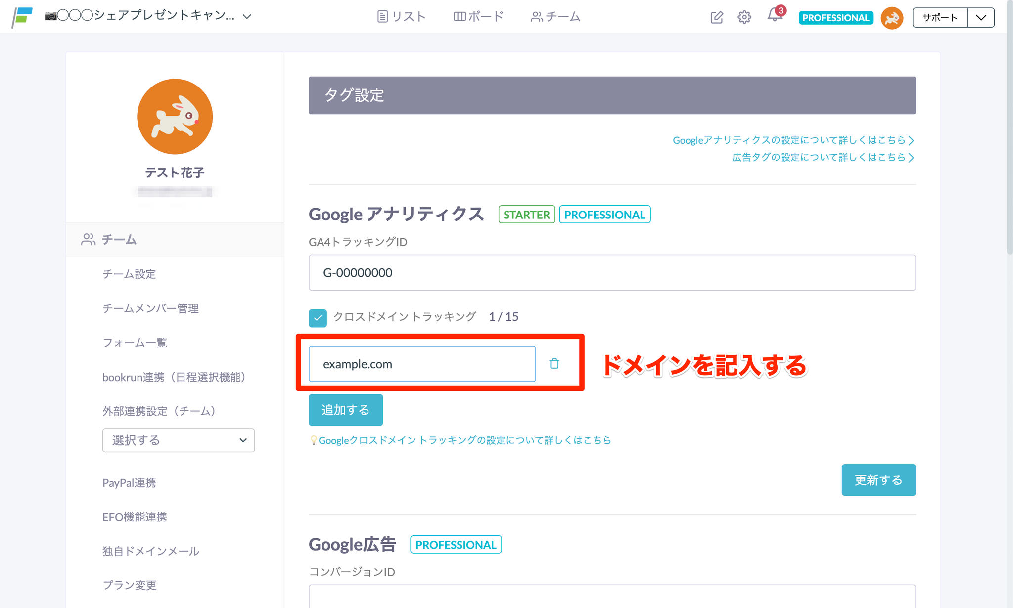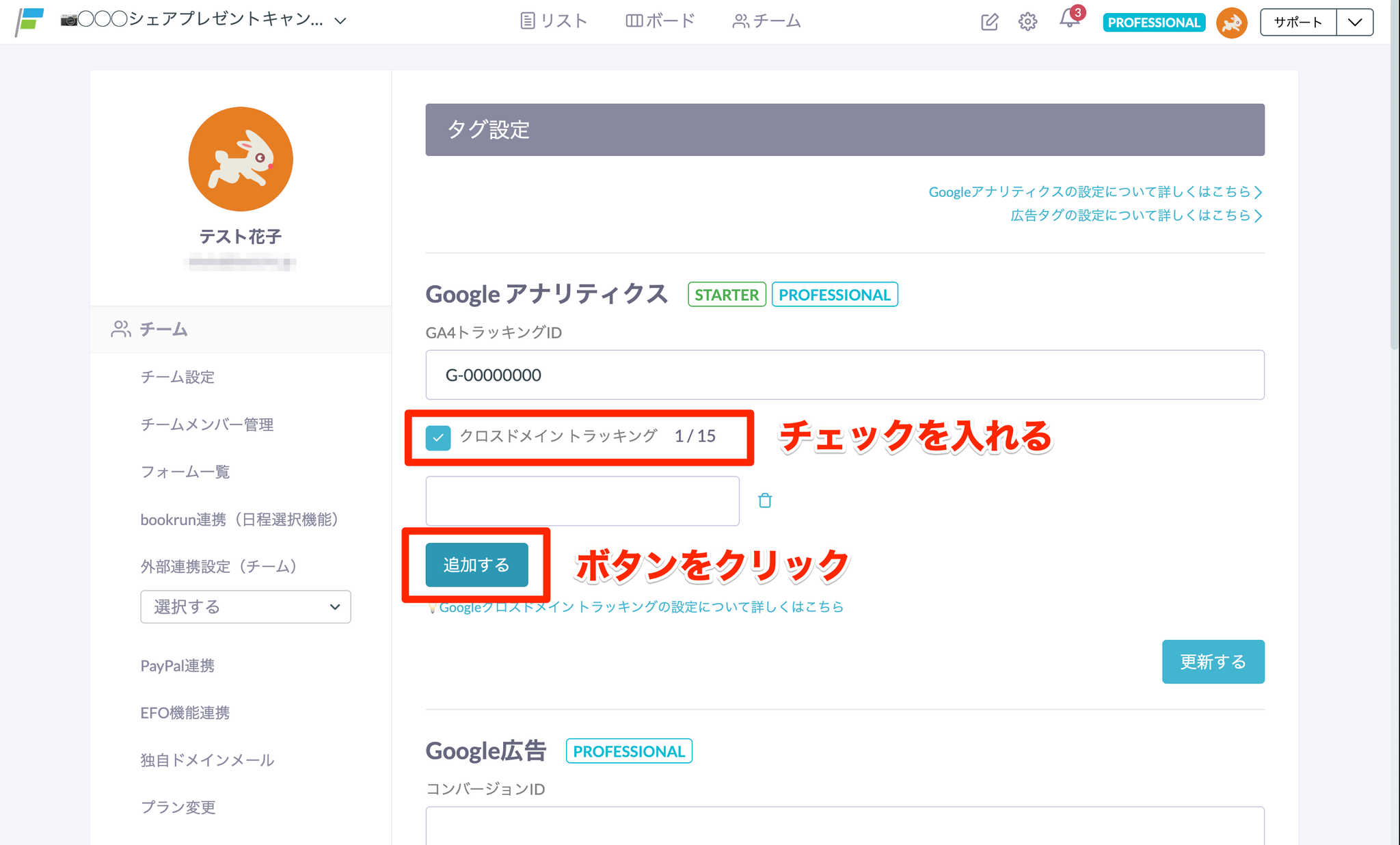 - formrun上でのこれまでの設定に加え、「クロスドメイントラッキング」にチェックを入れ、「追加する」ボタンをクリックする