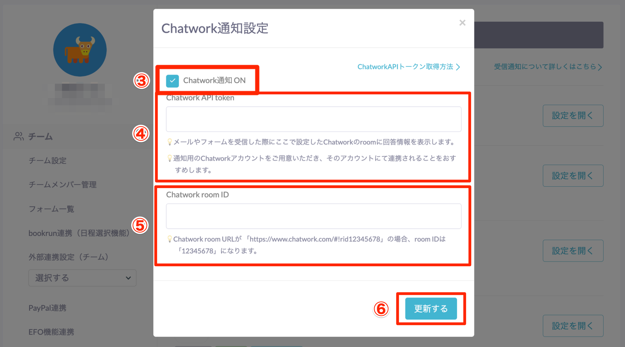 - Chatwork通知設定のモーダルより、「Chatwork通知ON」にチェックを入れる。