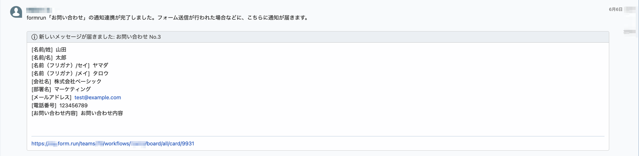 なお、通知の種類を選択したり(例:フォーム回答の通知のみ)、通知項目を絞ったりすることはできません(例:名前と会社名のみ通知)。