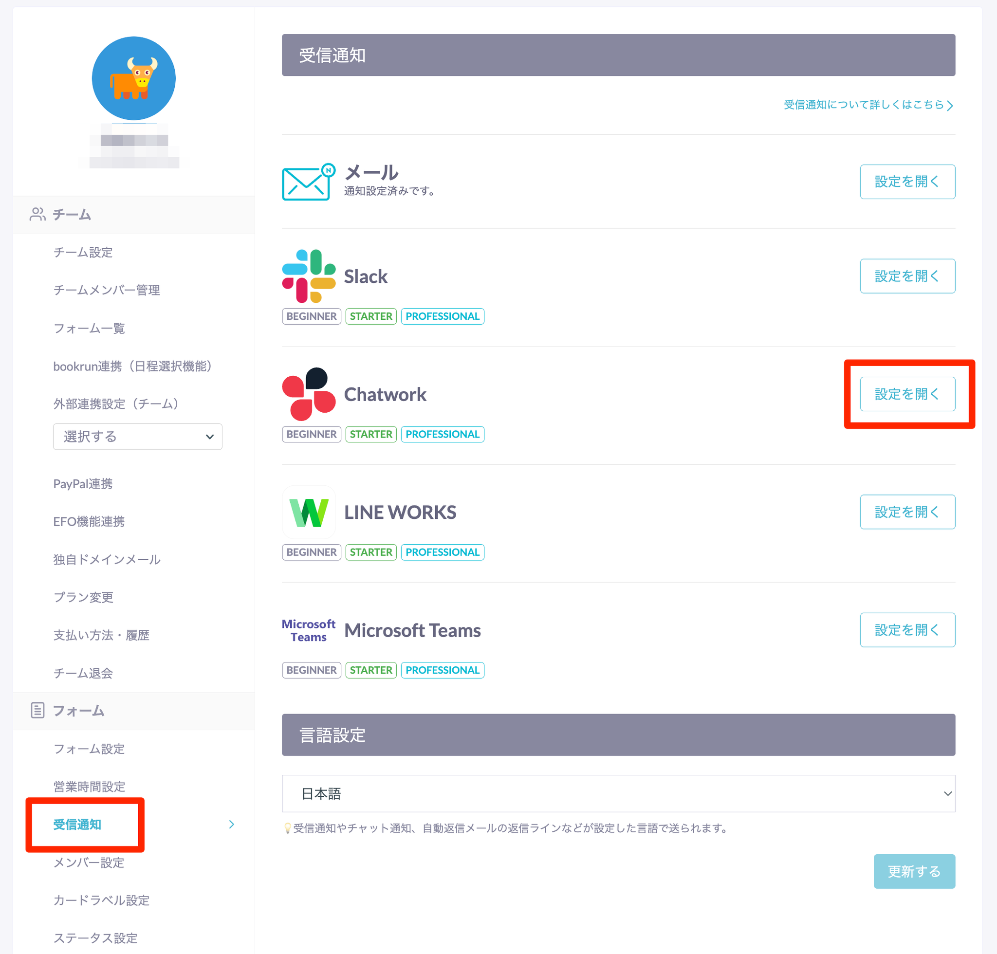 - 設定画面「フォーム>受信通知>Chatwork」より「設定を開く」をクリックする。