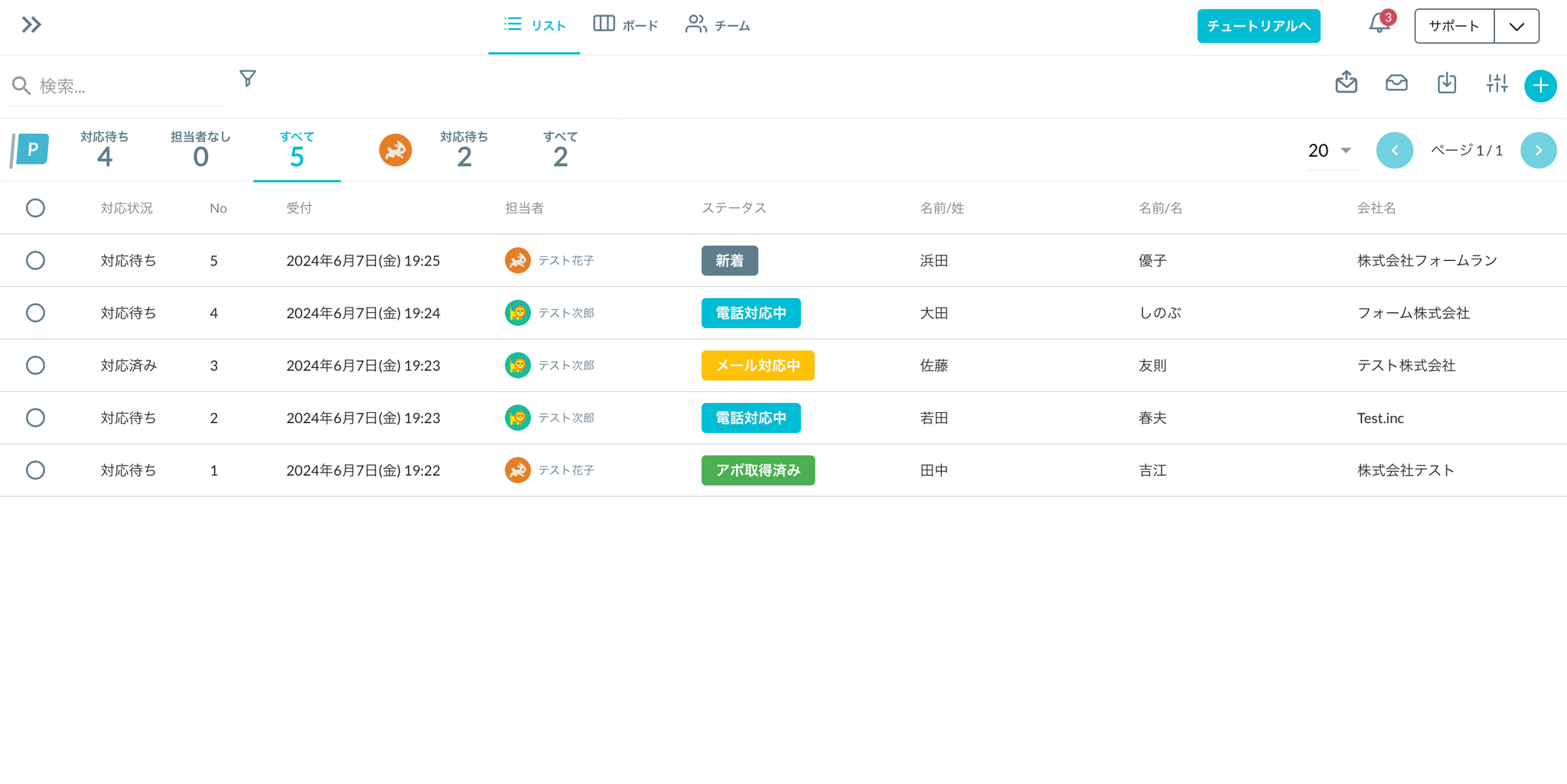 回答内容を一覧で確認でき、ステータスや担当者を一括で変更する際に便利です。