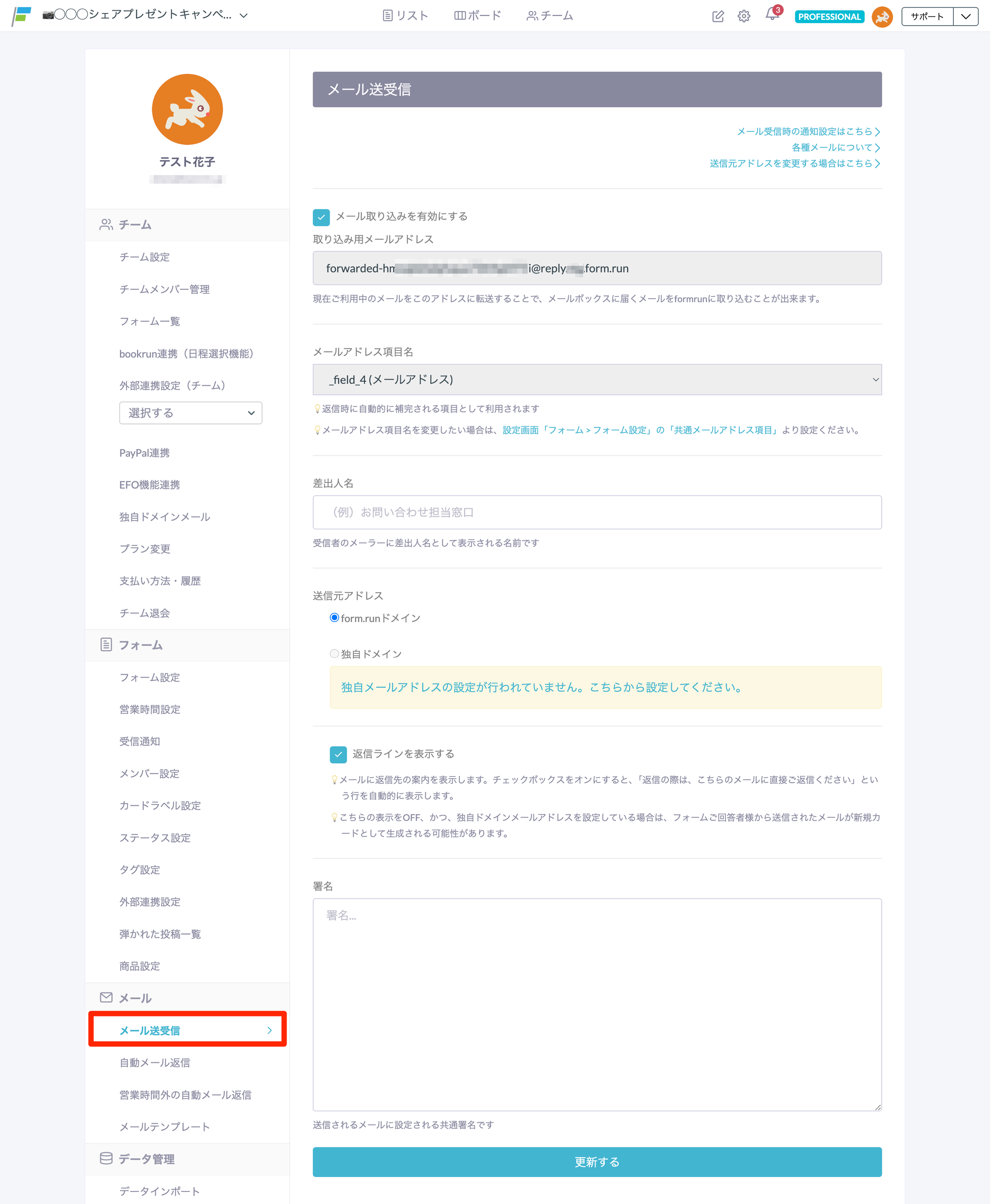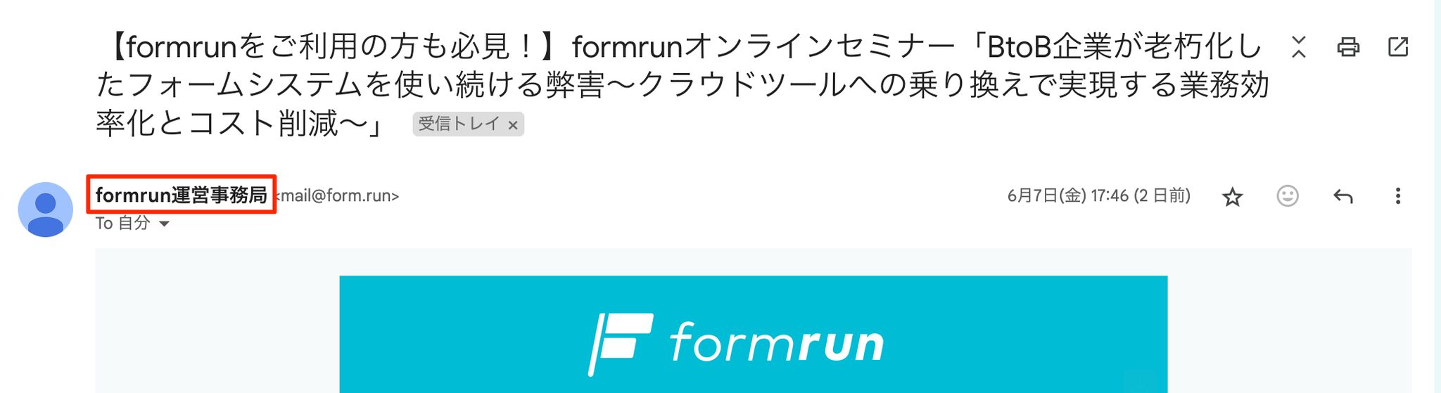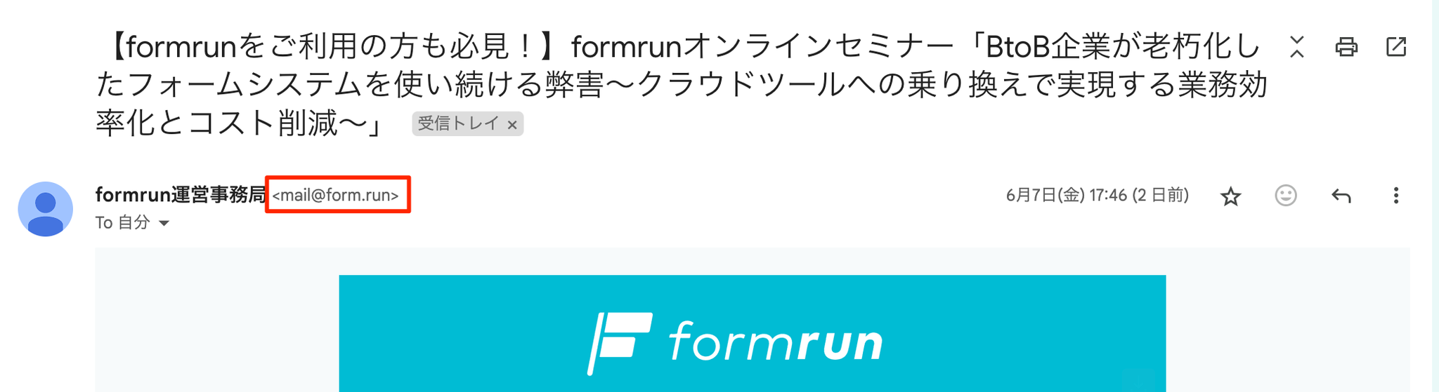 独自ドメインを設定しない場合はform.runというドメインから送信され、メールアドレスの変更はできません。