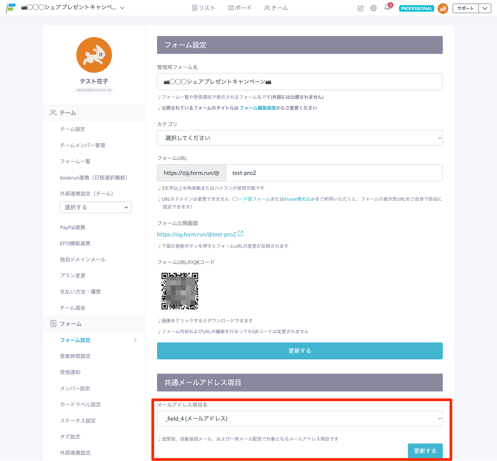1フォームあたり1項目のみ指定でき、自動返信メールや一斉メールの宛先はこの項目の設定により決まります。