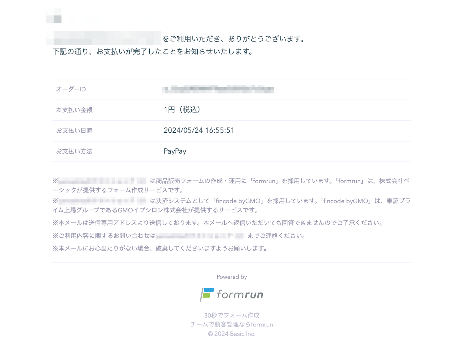 - 認証が完了すると、決済およびフォーム回答が完了します