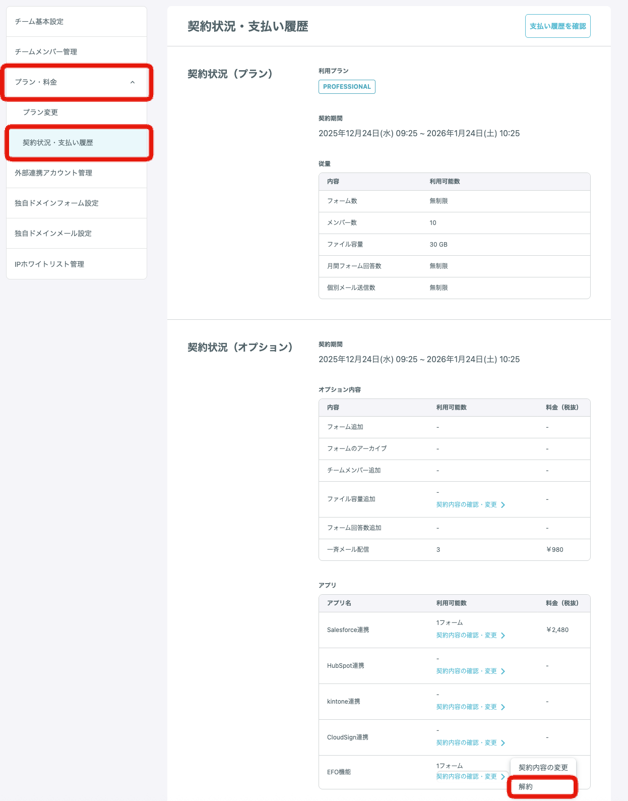 解約時の決済サイクル前払い後払いオプションごとの解約方法EFO(フォーム最適化)機能外部ツール連携機能一斉メール配信機能フォームのアーカイブ機能コード型フォーム(FREEプランのみ)フォーム購入オプションA. フォームを削除するB. フォームをアーカイブするC. 上位プランへアップグレードする月間フォーム回答数の上限追加オプションA.上位プランにアップグレードするB.オプションの契約内容を変更するメンバー追加(PROFESSIONALのみ)フォーム保存容量追加(PROFESSIONALのみ)