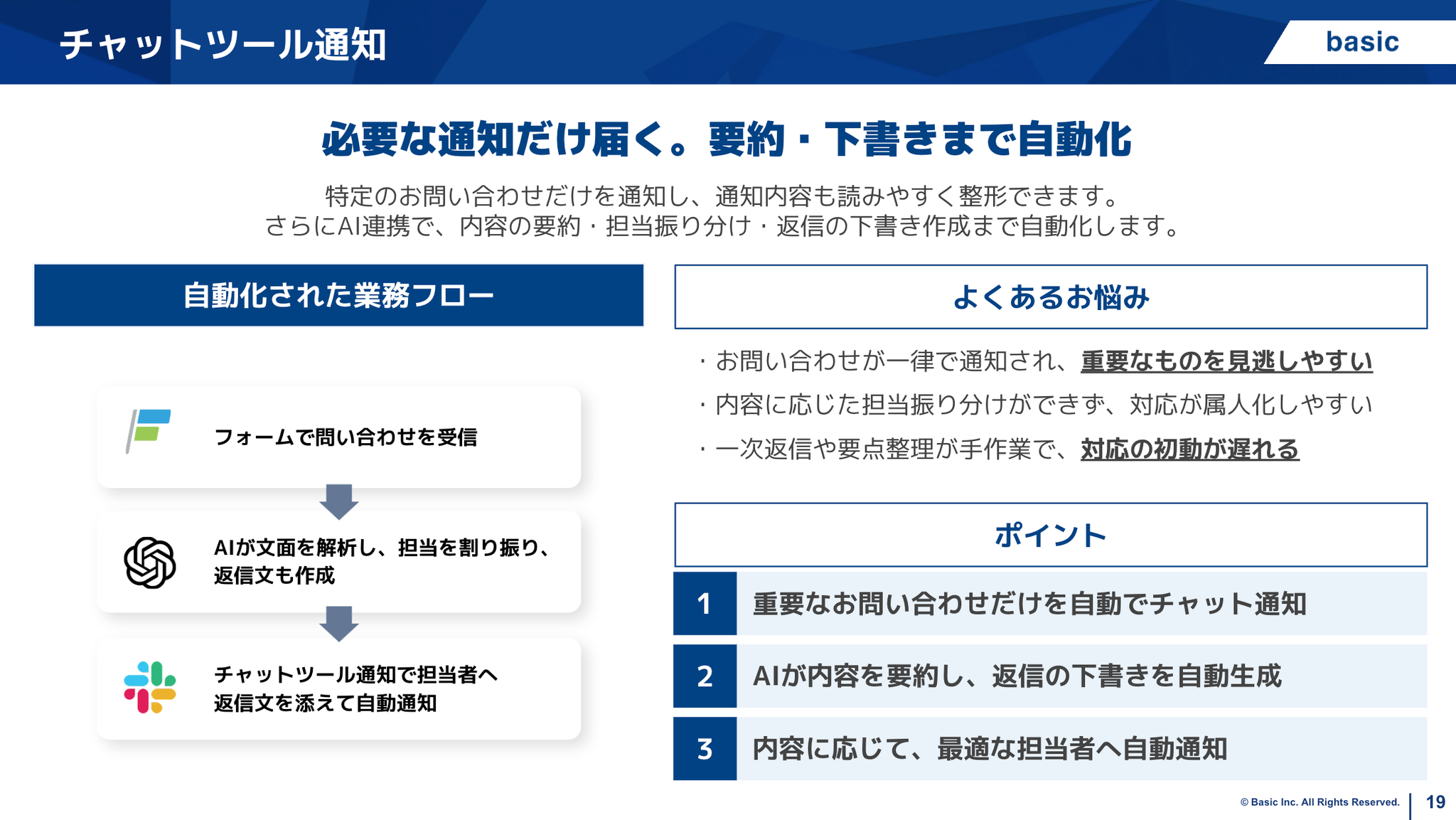 なお、AIワークフローツール『workrun』と組み合わせると、特定のお問い合わせのみの通知や、通知内容の編集が可能です。
