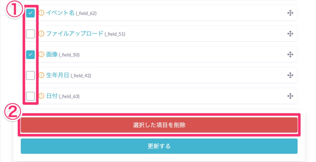 設定画面「データ管理設定>データ項目管理」にて、フォーム上で使用されていないデータ項目を削除できます。