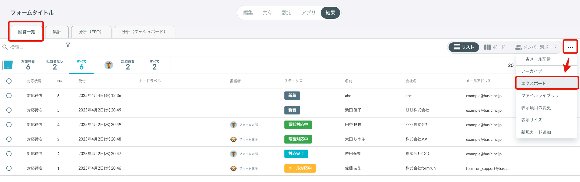 - 回答一覧画面に遷移し、右上の「…」から「エクスポート」をクリックする