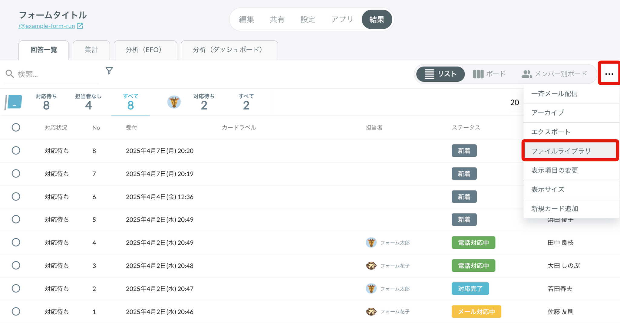 複数のフォームの顧客情報はすべて顧客画面に溜まっていきます。こちらをまとめて出力できます。