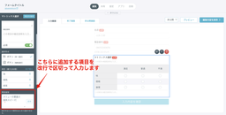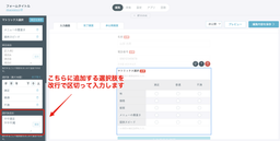 複数の項目や選択肢を追加する場合は、「項目追加」または「選択肢追加」の入力スペースに、項目や選択肢をそれぞれ改行で区切って入力し「追加」ボタンを押すと、一括で追加できます。