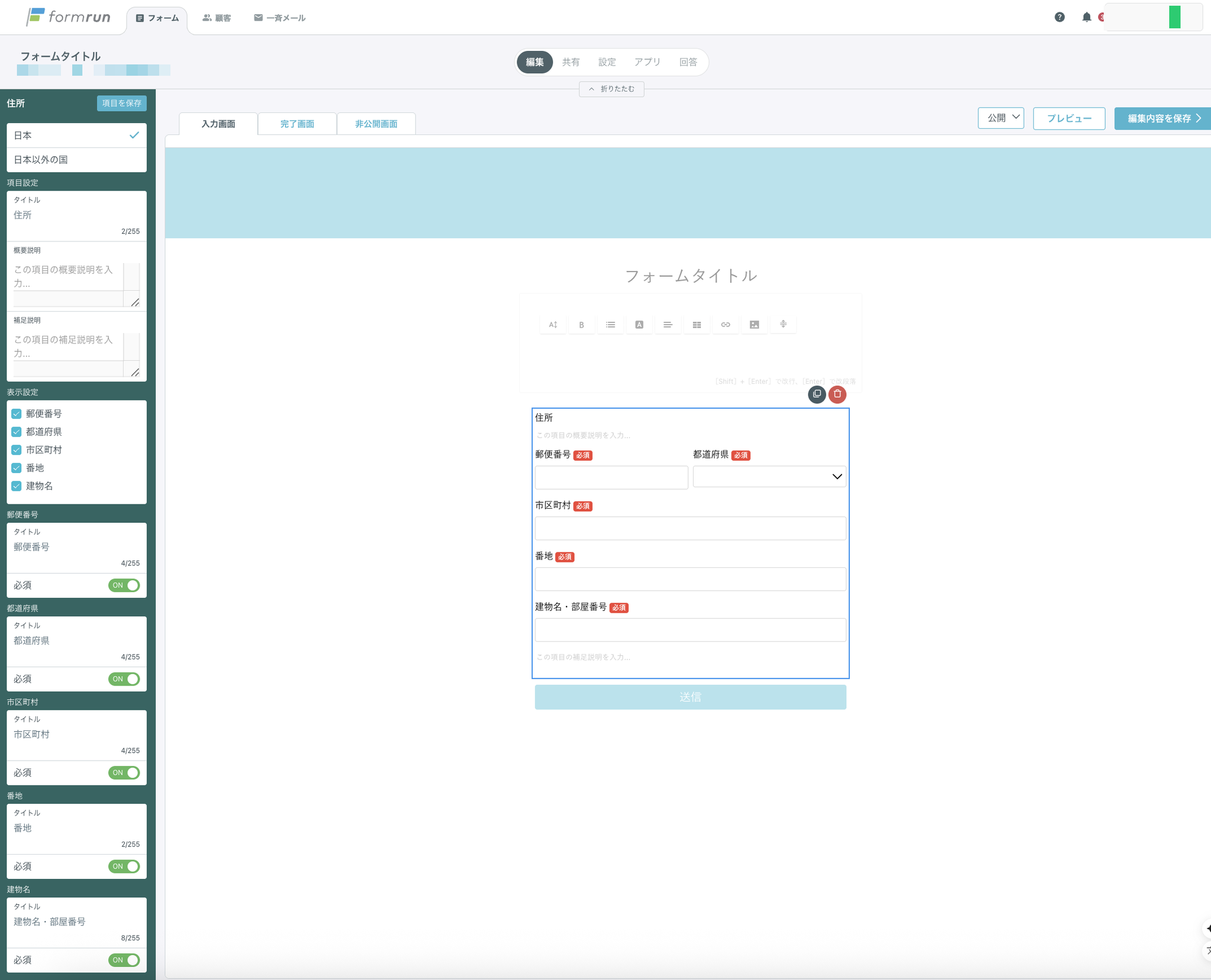 住所項目では、表示・非表示や必須・任意を項目ごとに設定できます。
