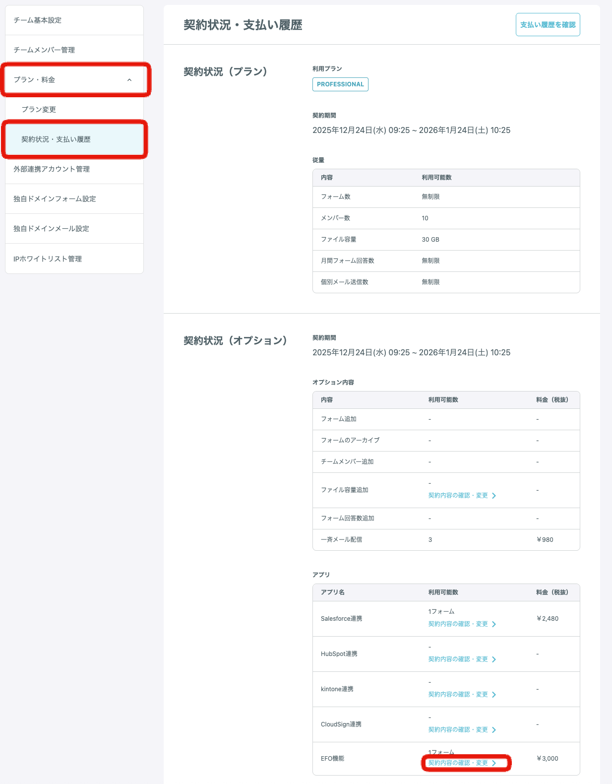 それ以降は毎月の契約更新日時に、プランの利用料金とEFO機能の追加料金が前払いで請求されます。