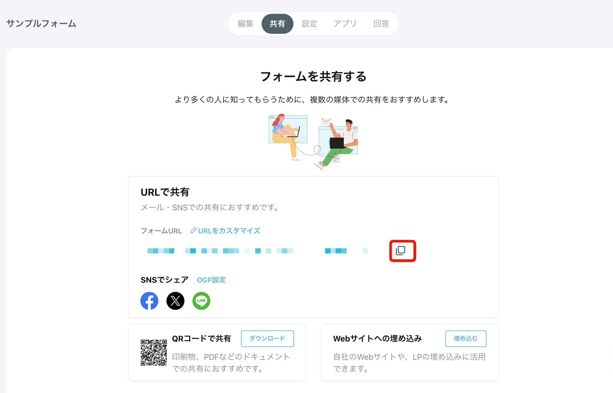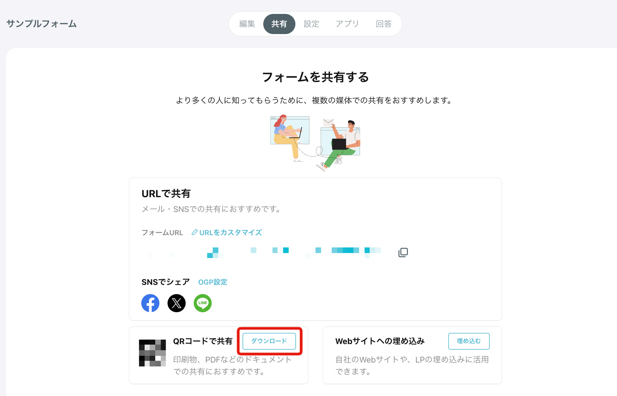 - QRコードで共有する(フォームURLを変更しても、QRコードは変更されません)