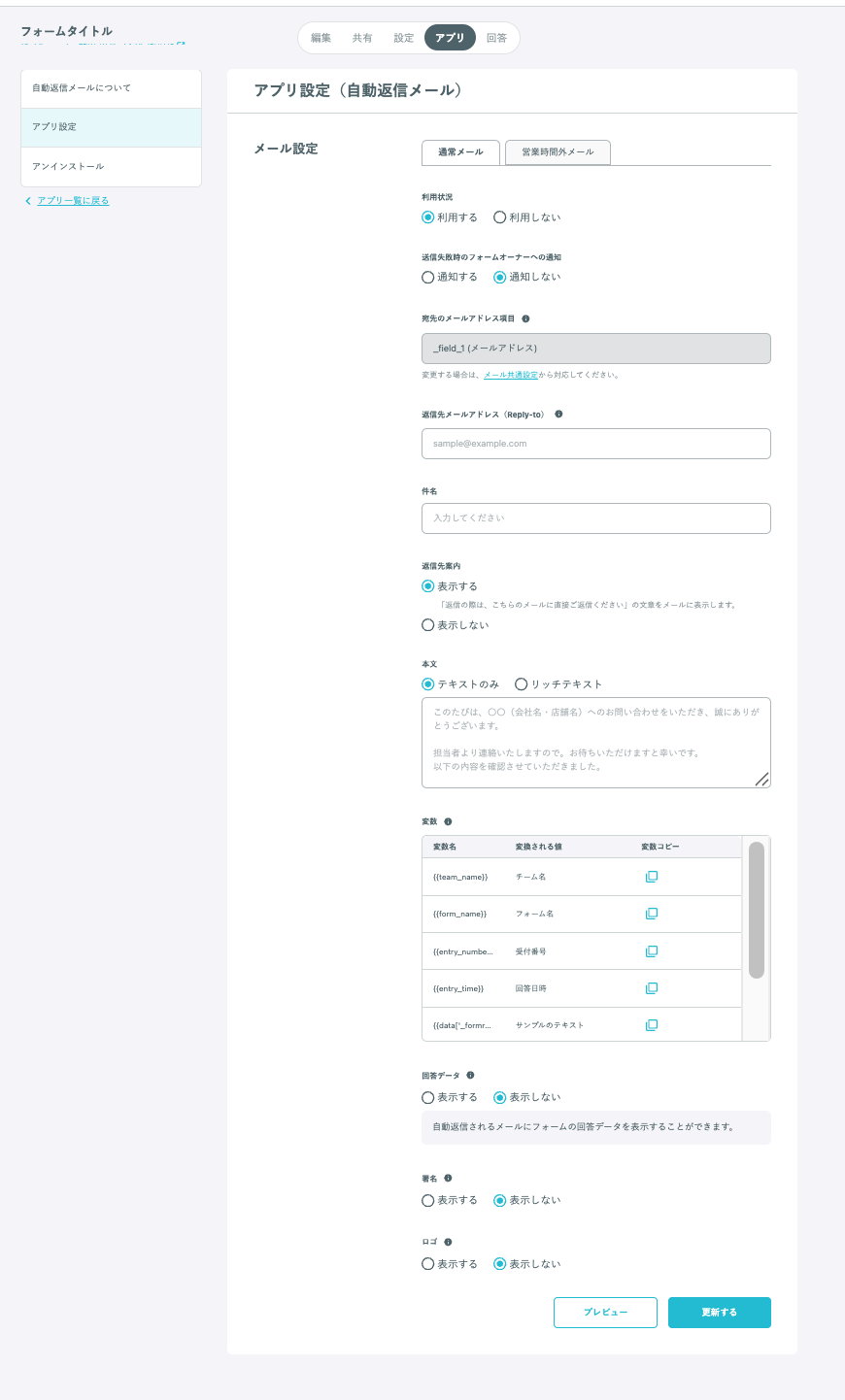 自動返信メールとは設定手順1. インストール2.フォームに設定する変数機能で回答内容を文面の中に入れ込む方法署名を設定する方法自動返信メールの署名機能とは設定方法ロゴを追加する方法自動返信メールのロゴ機能とは設定方法