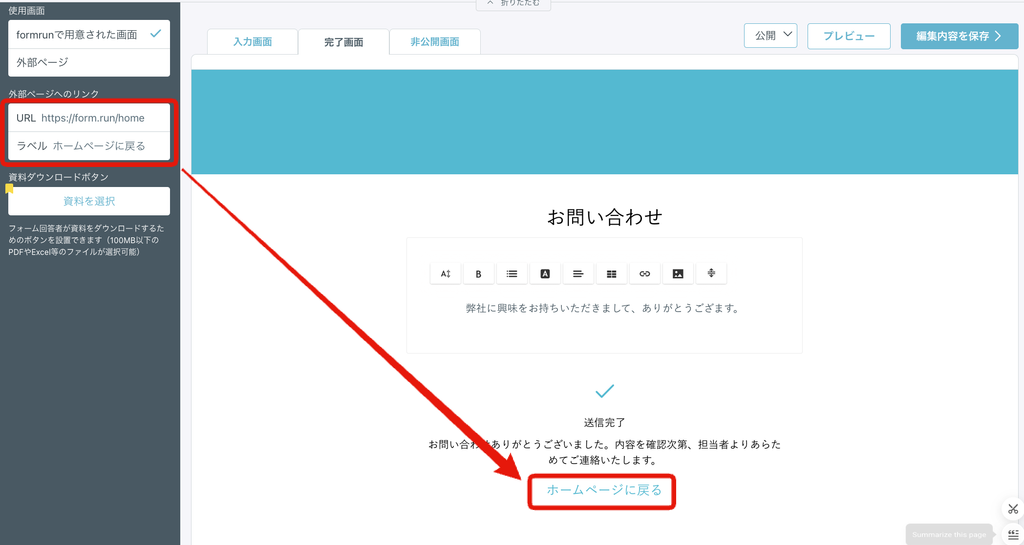 編集する画面の切り替えには、フォーム編集画面の上部で「完了画面」を選択してください。