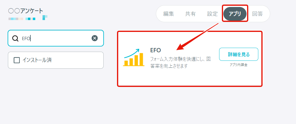 - フォーム編集画面の「アプリ一覧」よりEFOアプリをインストールする