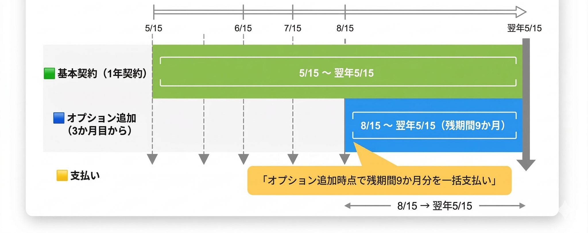 - 追加分は、契約期間終了までの期間分を前払いとなります
