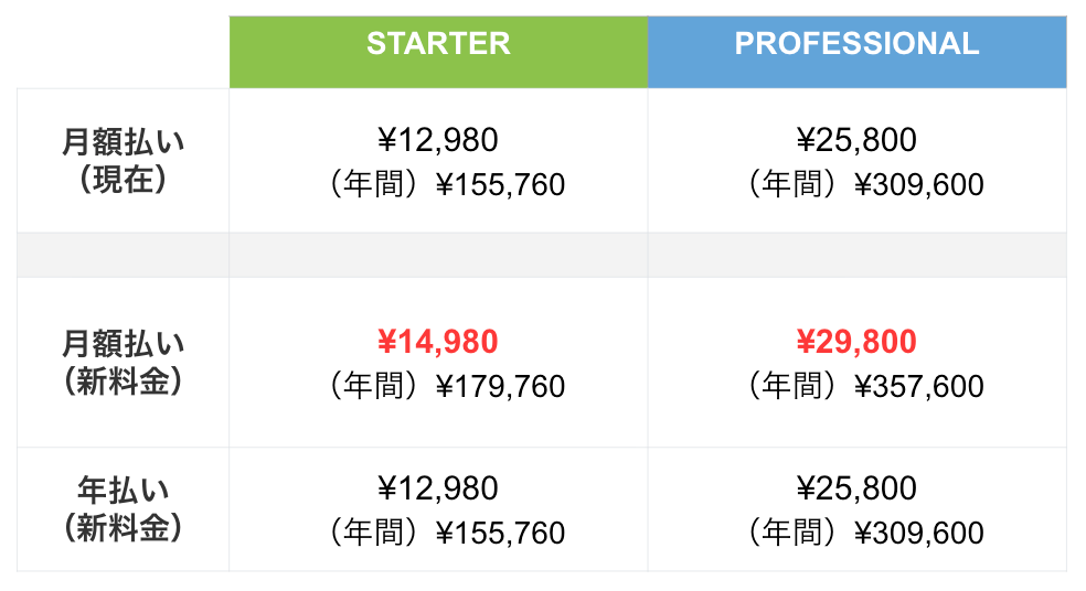 - 基本プランをSTARTERプランからPROFESSIONALプランにアップグレードされた場合は差額のお支払いとなります